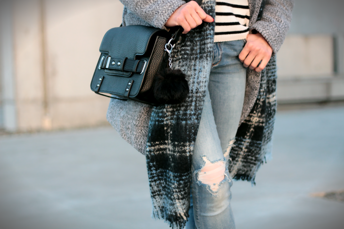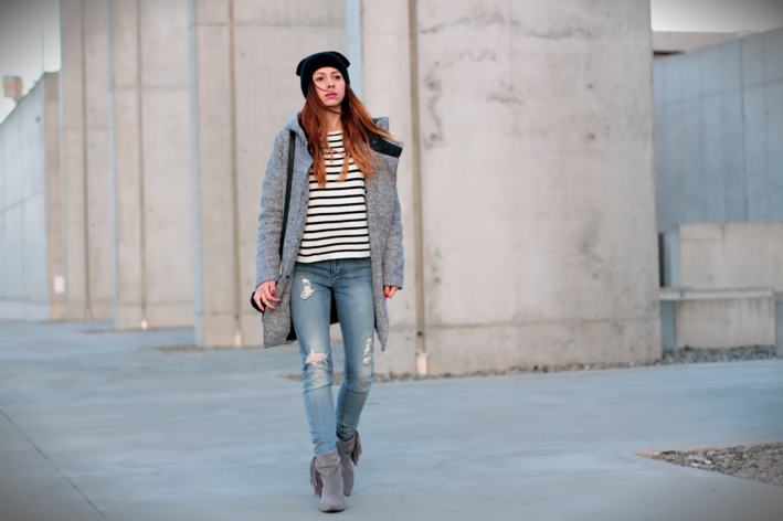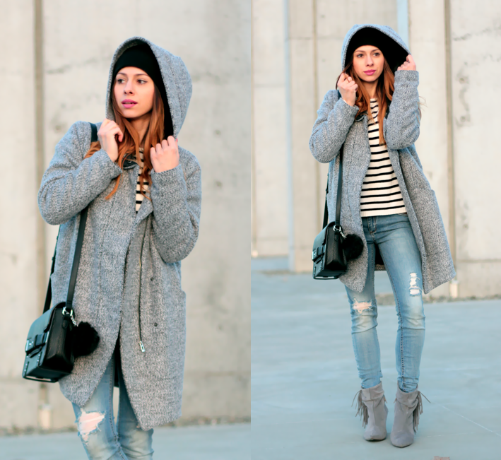 DŻINSY Z DZIURAMI, BOTKI Z FRĘDZLAMI I SZARY ZIMOWY PŁASZCZ