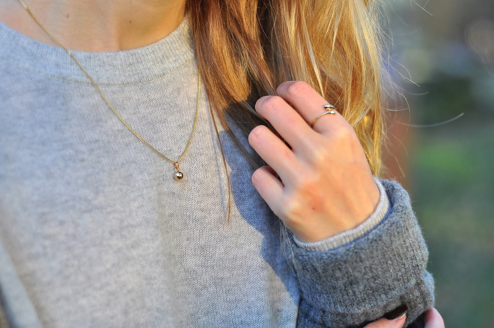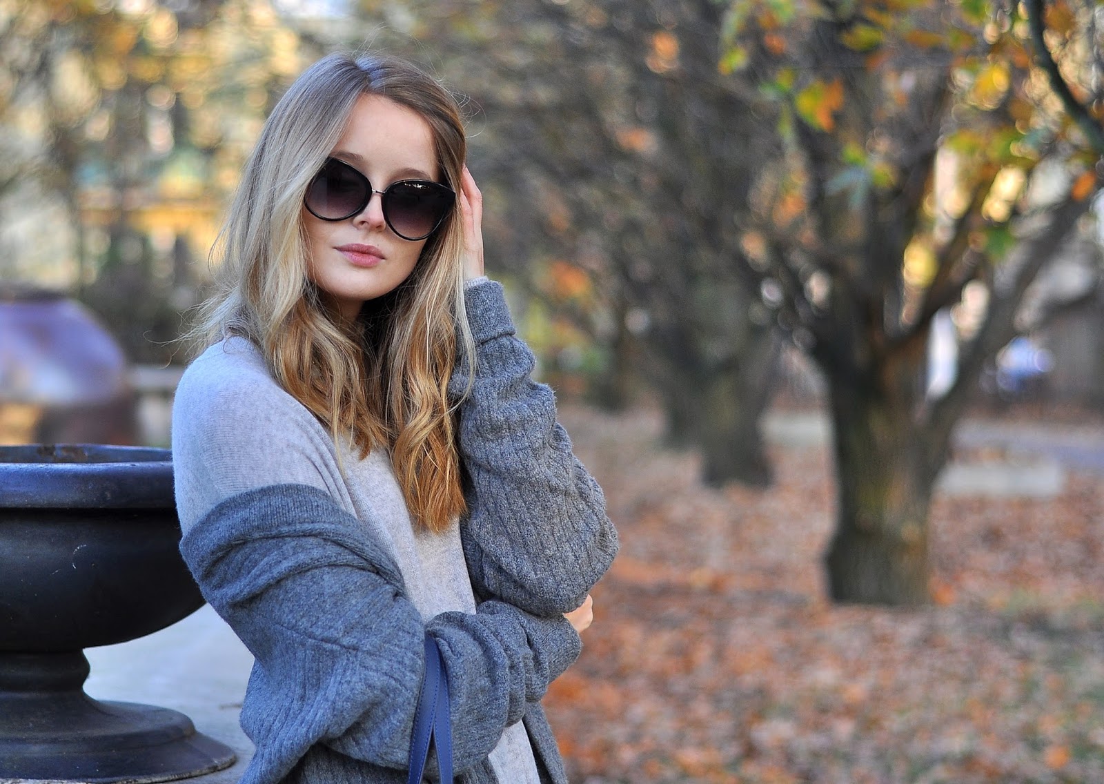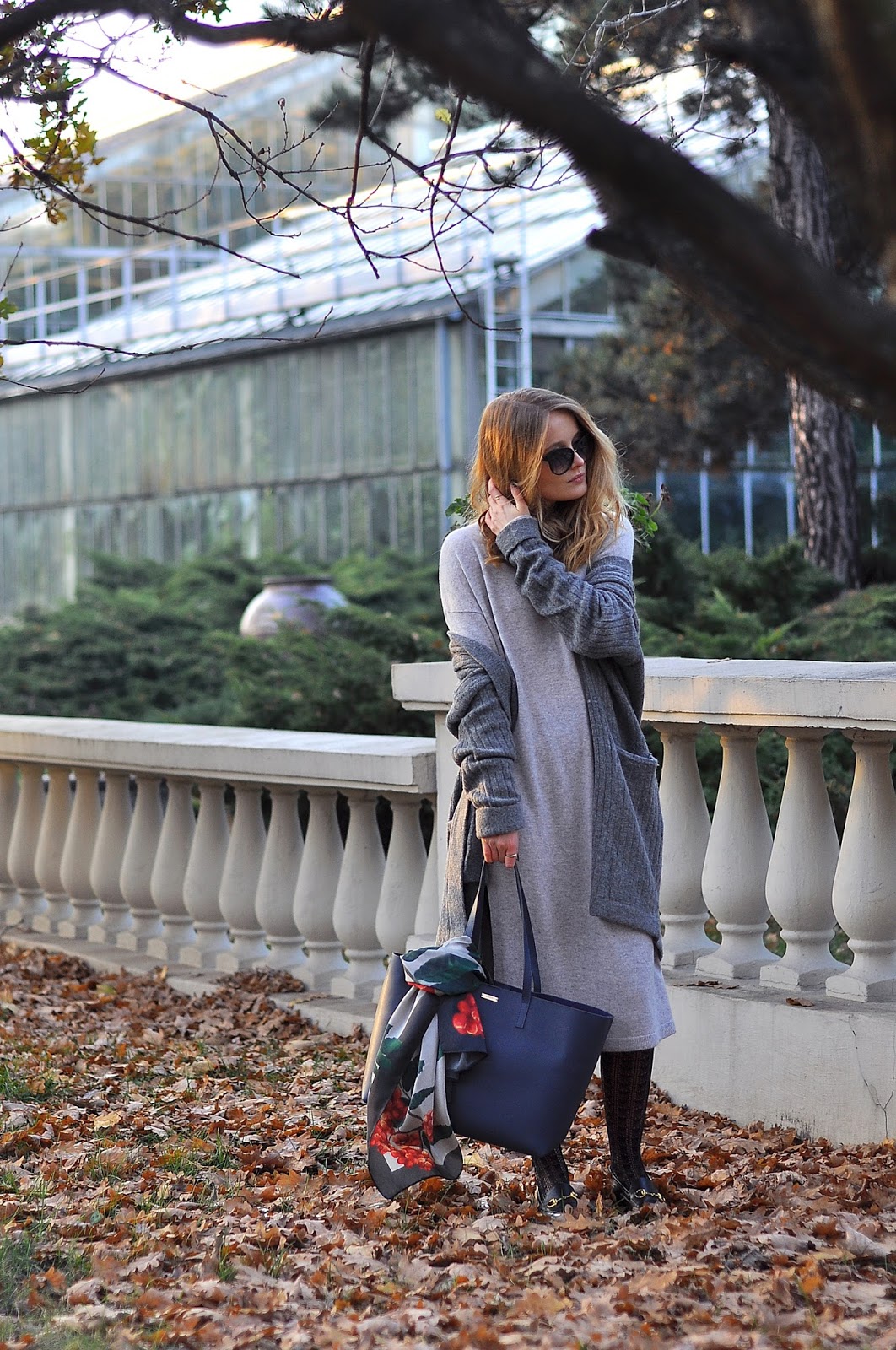 W tym przypadku, aby uzyskać zamierzony efekt zdecydowałam się na połączenie siwego, kaszmirowego, długiego sweterka z luźno zarzuconym na niego kardiganem, w nieco ciemniejszym odcieniu szarości. Mała zabawa naturalnymi tkaninami oraz ich fakturami i stonowanymi barwami, a także podkreślenie całości minimalistyczną, złotą biżuterią i klasycznymi dodatkami, moim zdaniem idealnie wpisuje się w estetykę kobiety zmysłowej.