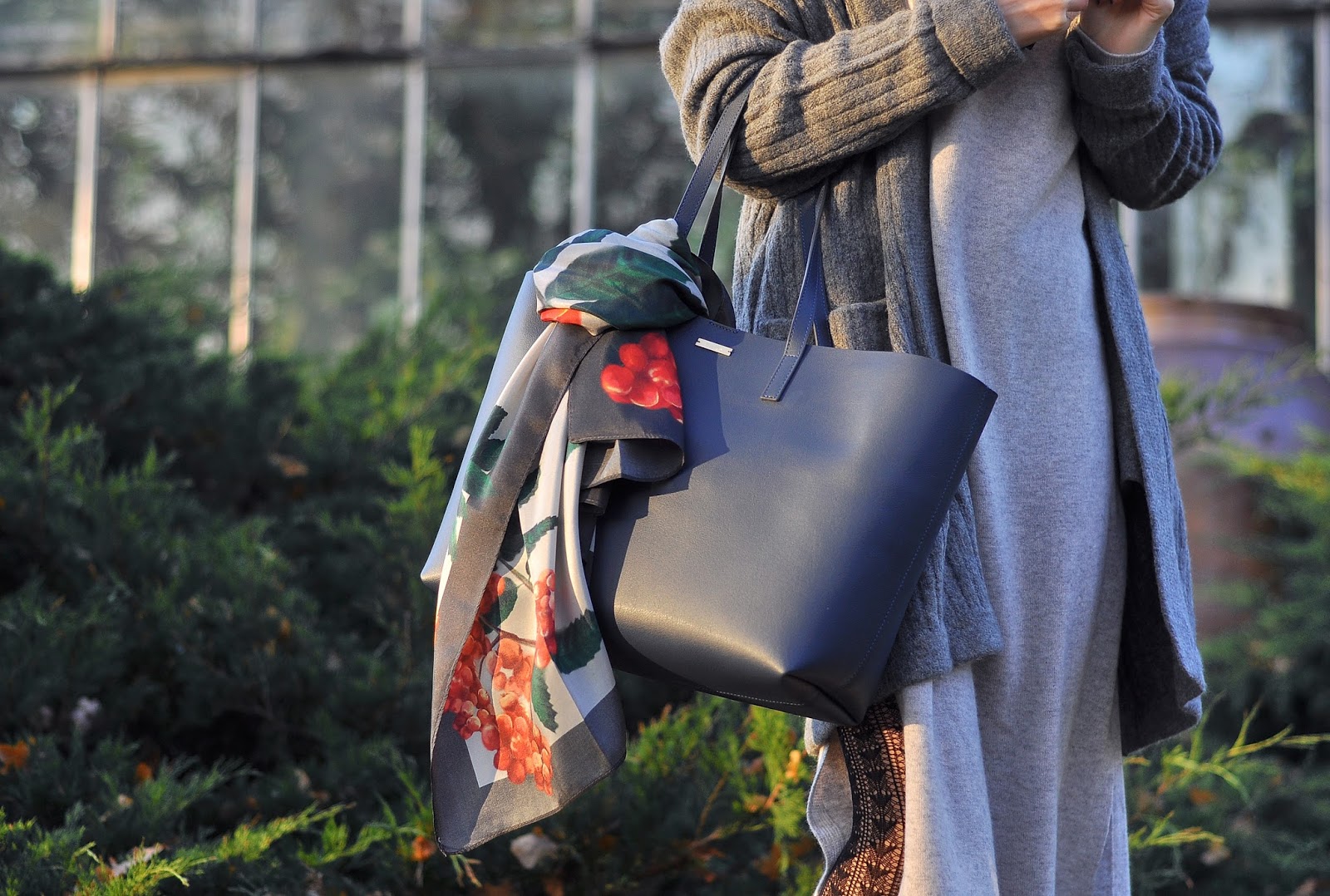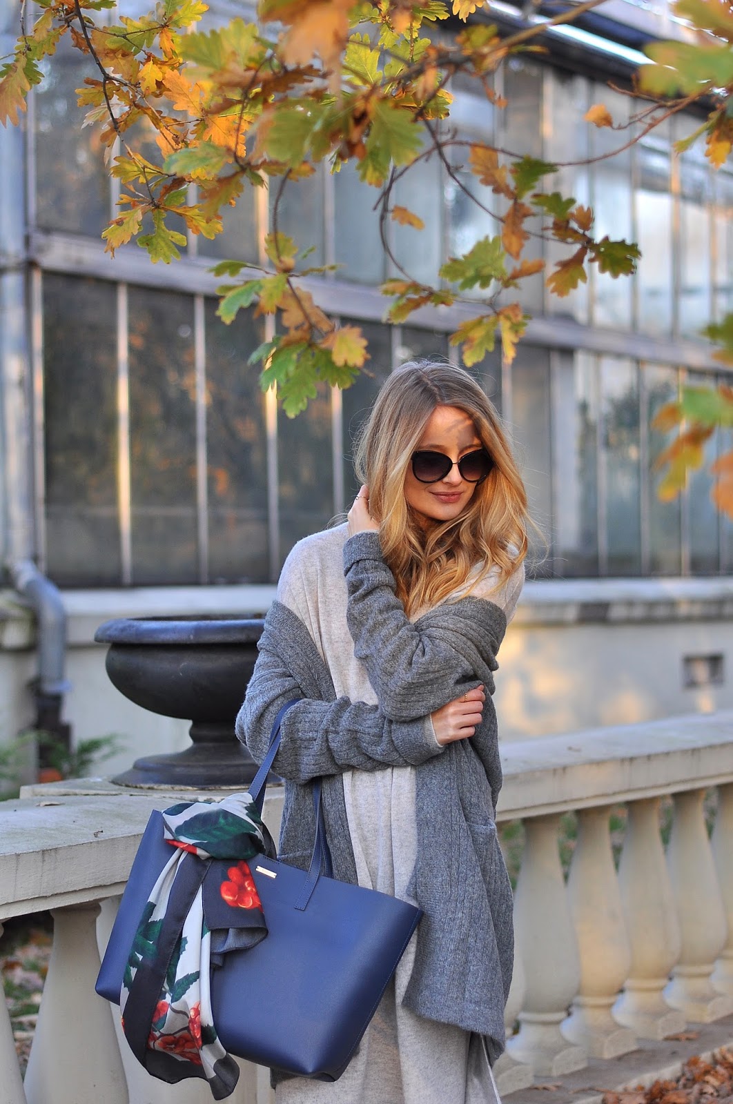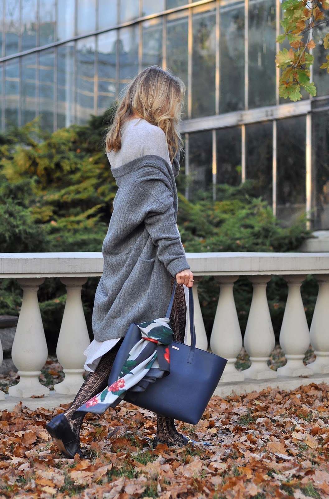 W tym przypadku, aby uzyskać zamierzony efekt zdecydowałam się na połączenie siwego, kaszmirowego, długiego sweterka z luźno zarzuconym na niego kardiganem, w nieco ciemniejszym odcieniu szarości. Mała zabawa naturalnymi tkaninami oraz ich fakturami i stonowanymi barwami, a także podkreślenie całości minimalistyczną, złotą biżuterią i klasycznymi dodatkami, moim zdaniem idealnie wpisuje się w estetykę kobiety zmysłowej.