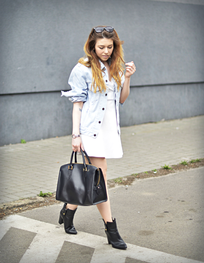 Zobacz oryginał ndz., 26/04/2015 - 17:37Błękitną, jeansową kurtkę Levisa upolowaną za kilkanaście złotych pokazywałam parę miesięcy temu w poście lumpeksowym. Dziś po raz pierwszy pojawia się w stylizacji, i czuję, że nie ostatni. Na początku miałam obiekcje co do tych wszystkich dziur, a teraz je polubiłam. Z rozmiarem też trafiłam, bo w kategorii kurtek jeansowych najmodniejszy jest teraz oversize. Biała sukienka pojawiła się na blogu w letnim poście z Monachium, i zdjęcia te należą do moich ulubionych, pewnie ze względów sentymentalnych.