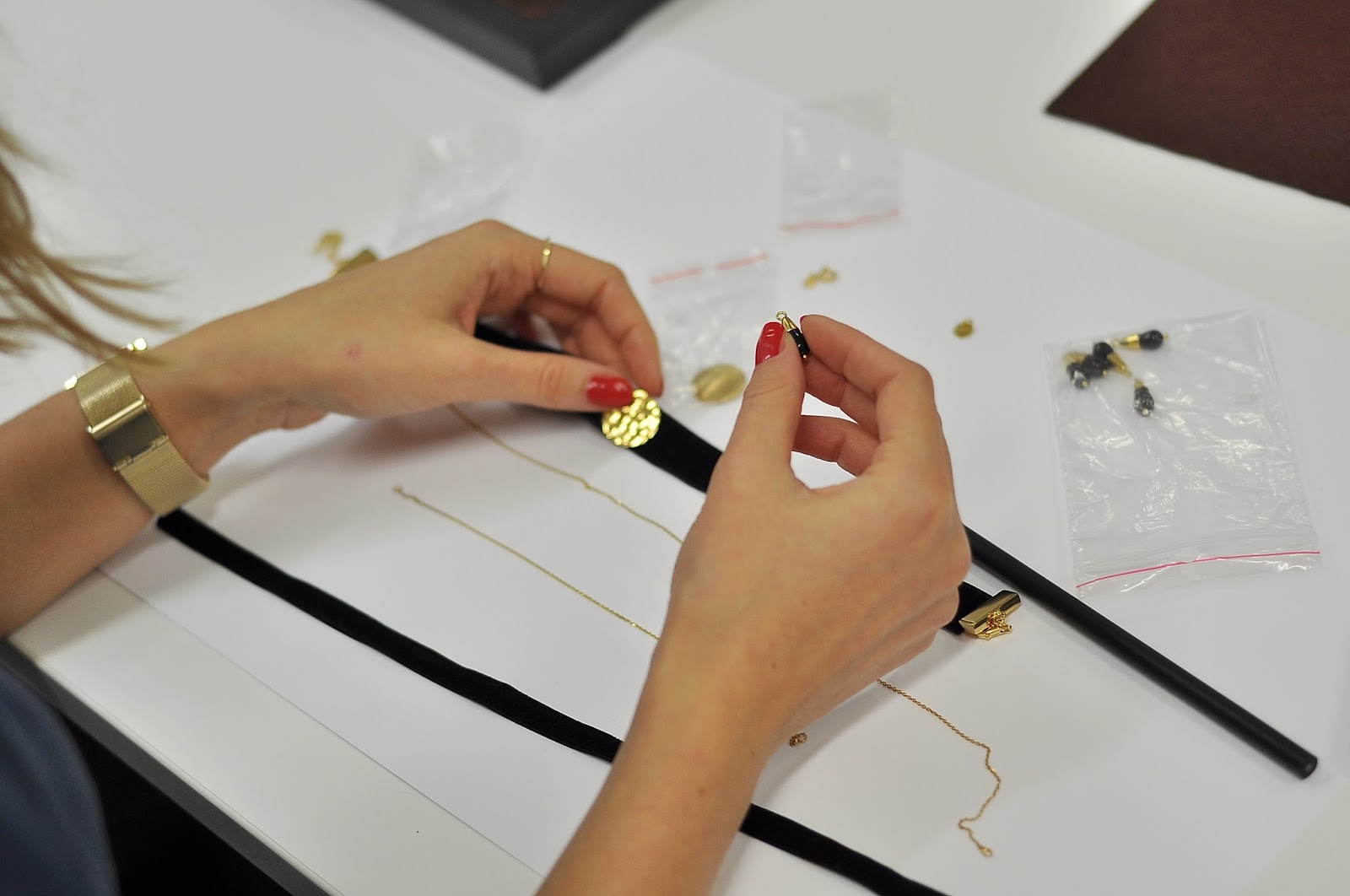 Następnie, razem z dziewczynami z Pica Pica, StyleDigger, Style On i Fashionelką przystąpiłyśmy do działania. Naszym zadaniem było stworzenie autorskiego projektu biżuterii - naszyjnika / chokera (jednego dla siebie i jednego dla naszych czytelników) z dostępnych półproduktów. Przyznam, że sprawiło to nam naprawdę dużo frajdy. Osobiście postanowiłam przygotować dwupoziomowy naszyjnik i minimalistyczny, czarny choker ze złotymi elementami - dla Was (więcej szczegółów niżej)