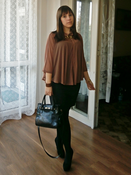 Zobacz oryginał czw., 13/03/2014 - 18:18Wylicytowałam sobie taką oto "bluzeczkę z półkola" jak to było napisane w opisie :) Gdy przyszła, obie z moją mamą się w niej zakochałyśmy :) Niestety nie było widać tego, że jest półprzezroczysta więc muszę pod nią zakładać zawsze jakiś top. Trendy trendami, ale bielizny to ja pokazywać nie chcę :)