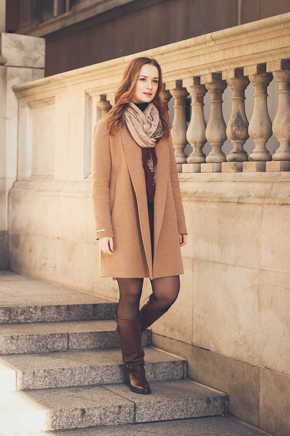 Trafalgar Square, to kolejny "must see" Londynu. Plac położony w centralnym Londynie, gdzie kiedyś znajdowały się stajnie królewskie. Dlaczego ma nazwę Trafalgar? Nazwa pochodzi od zwycięskiej bitwy pod Trafalgarem. Jego budowę rozpoczęto w 1829 roku. Na placu znajdziemy kolumnę Nelsona, który poległ w tej morskiej bitwie, oraz pomniki Jerzego IV (co ciekawe, Jerzy IV jest uważany za najbardziej znienawidzonego władcę Wielkiej Brytanii), generała Havelocka oraz generała Napiera. Od 1999 roku (z krótką przerwą) co roku Trafalgar Square zdobi nowa rzeźba, w tym roku jest to szkielet konia z kokardą symbolizująca Londyńską Giełdę - poprzednio był to niebieski kogut. Bedąc na Trafalgar Square warto zajść do National Gallery, gdzie możemy znaleźć znane dzieła (np. Słoneczniki Van Gogha). Pamiętajcie by na zwiedzanie ubrać się przede wszystkim wygodnie jak i ciepło, ja postawiłam na długi płaszcz, golf, spódniczkę i kozaki. A wszystko zachowałam w pasujących do siebie kolorach by czuć się również elegancko.