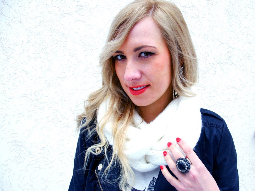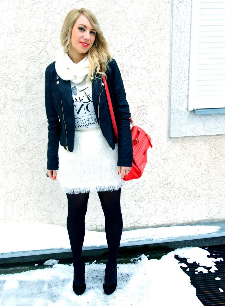Proste biało-czarne zestawienie kolorystyczne wzbogaciłam ciekawymi fakturami i ulubioną koralową pomadką. Połączenie to polecam wszystkim Paniom o tak jak nieco bujnych kształtach. Świetnie sprawdzi się w czasie wieczornego wyjścia.