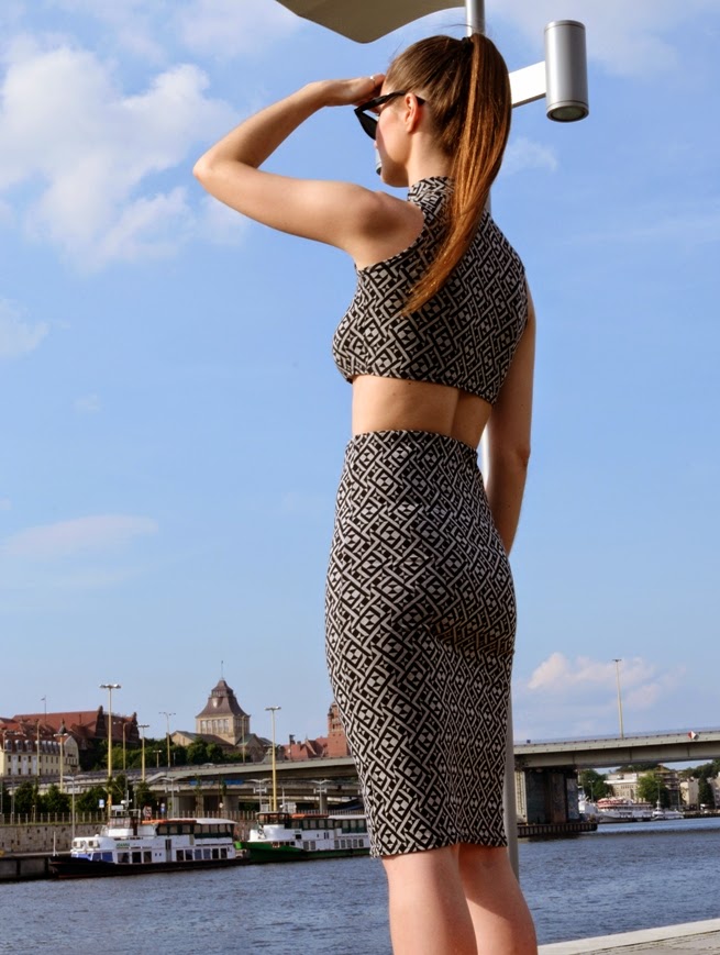 /PL/ Trend łączenia ze sobą krótkiego topu i dopasowanej ołówkowej spódnicy powrócił już kilka sezonów temu i jest tu aby zostać z nami na dłużej. Jest to wyrafinowany i zarazem seksowny trend a jego wszechstronność zapewnia że można go nosić zarówno w dzień jak i wieczorem. Ponieważ mój zestaw ma geometryczny wzór postanowiłam zachować wygląd czysty i minimalistyczny, bez rzucających się w oczy dodatków.