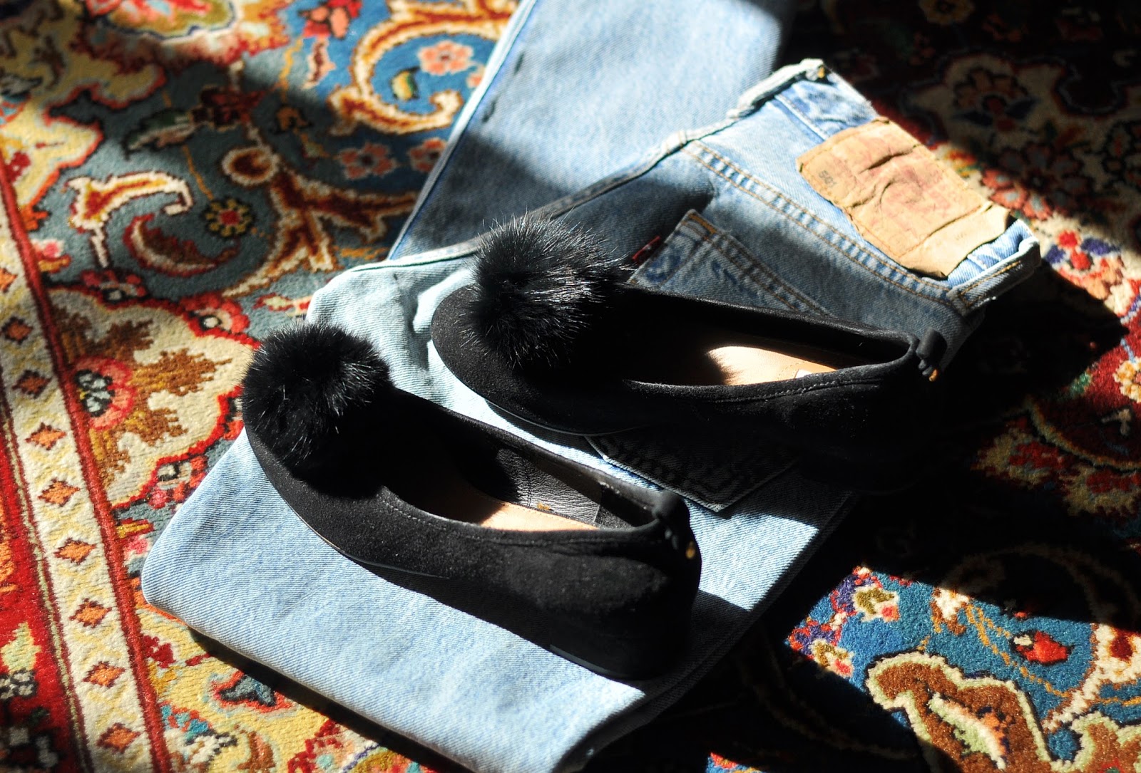 Pamiętacie moje czarne, skórzane baleriny na podwyższonym obcasie (z tego wpisu)? Nie należą one co prawda do najstarszych nabytków, jednak chęć posiadania butów z puszystą, włochatą ozdobą okazała się silniejsza i sprawiła, że to właśnie one stały się idealnym kandydatem do przeprowadzenia małej metamorfozy. Dwa futrzane pompony + igła, nitka i voilà! Mały detal nadał całości zupełnie innego, nieco bardziej dziewczęcego charakteru. Świetnie sprawdzają się w prostych, klasycznych zestawieniach - o czym będziecie mogły przekonać się już wkrótce :)