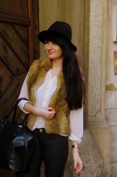 Przejdźmy do zestawu - w roli głównej ukochany futrzak, czyli brązowo-ruda kamizelka. Połączyłam ją z bielą i czernią i charakterystycznymi dodatkami - kapelusz i botki z przeźroczystymi koturnami.