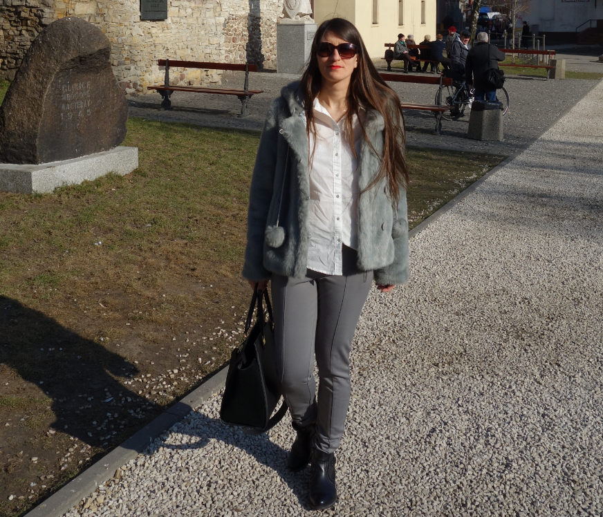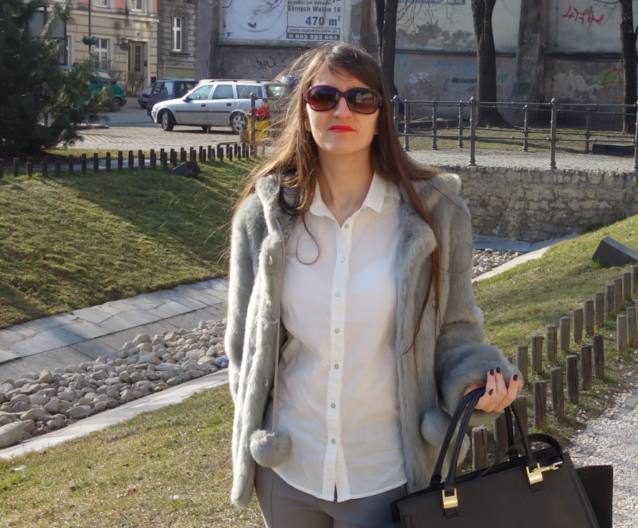 Do meritum : futro - cieplutkie, zimowe, zestawione ze spodniami w tym samym odcieniu. Koszula pod futrem - cieniutka, przewiewna, czułam się mega komfortowo. Polecam taki zestaw wszystkim, którzy podobnie jak ja zagapili się zimą, a mają ochotę coś zimowego jeszcze obnosić. Koszula biała, buty i torebka czarne, biały i czarny daje szary, więc wszystko pozostaje w kolorystycznej rodzinie!