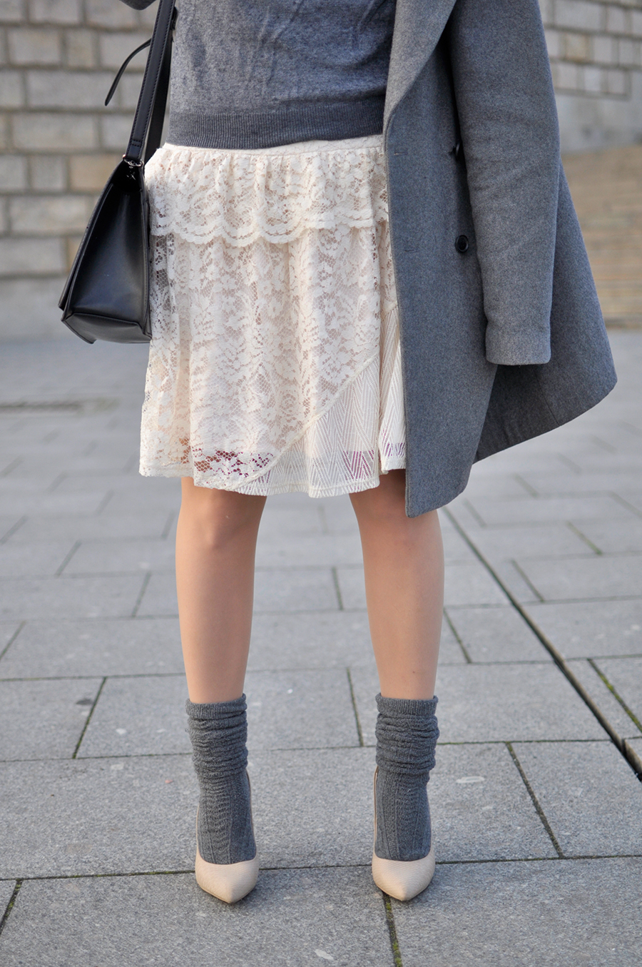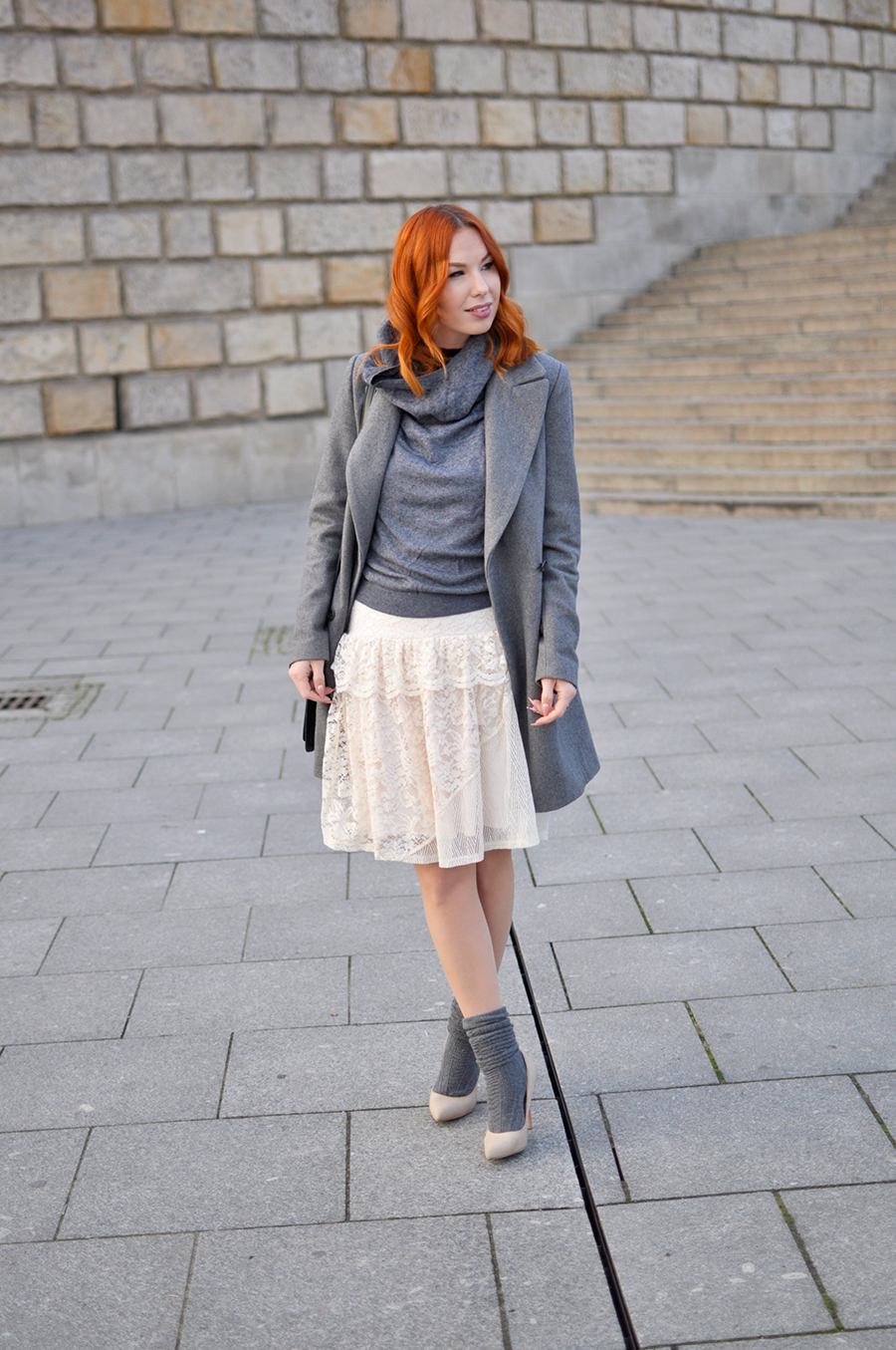 1. Po pierwsze NIE REZYGNUJĘ ze swoich ulubionych szpilek zimą. Zazwyczaj, gdy nadchodzi chłód, a słupek rtęci spada, wymieniamy obuwie na cieplejsze, tym samym rezygnując z odkrytych lekkich szpileczek. Jednym ze sposobów na noszenie ulubionych butów zimą jest zestawienie ich właśnie z ciepłymi skarpetkami. Tak jak w stylizacji z dzisiejszego posta :)