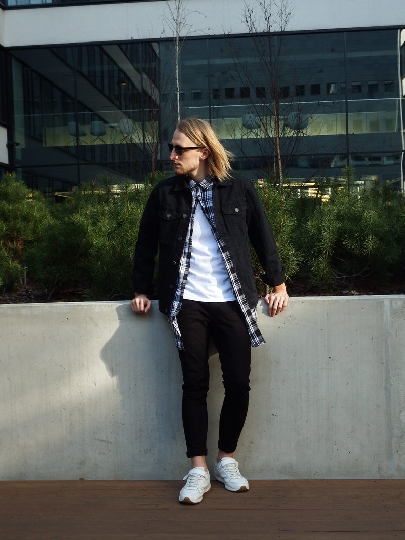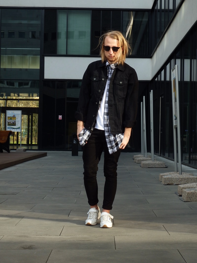 Po kolorach czas na czerń i biel. Tym razem postawiłem na długą koszulę w czarno-białą kratę, zwykły biały T-shirt i niezastąpioną kurtkę jeansową. Moja co prawda jest czarna ale i tak cieszę się, ze udało im się ją upolować za bezcen! :D