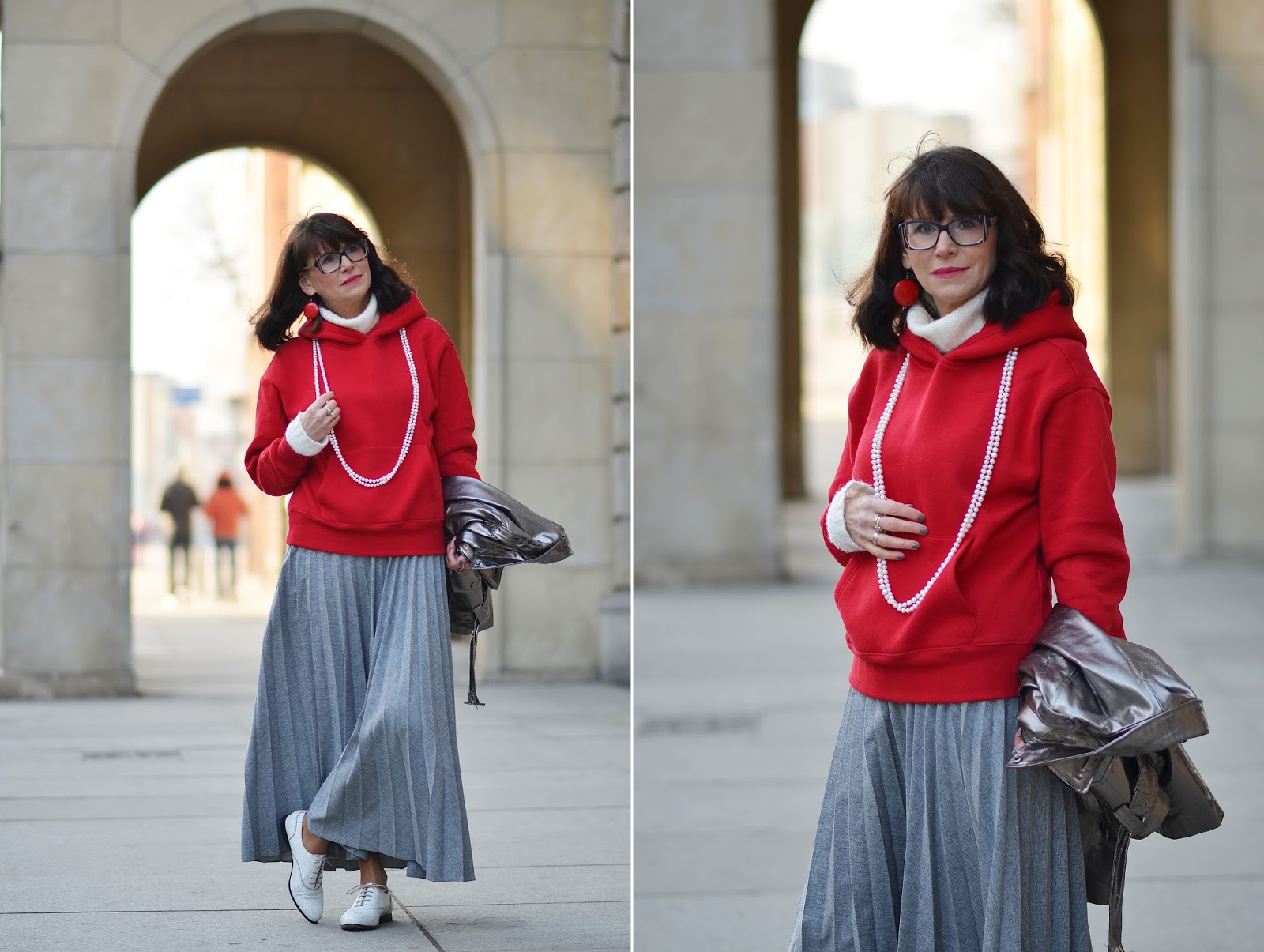 Długa, plisowana spódnica, ciepły sweter, złota, skórzana kurtka i w to wszystko "wmieszana" jest czerwona bluza i ... sznur pereł :) Mnie do czerwieni zawsze buzia się uśmiecha i krew szybciej zaczyna krąży, a że dzisiaj Walentynki, to wszystko pasuje! :)