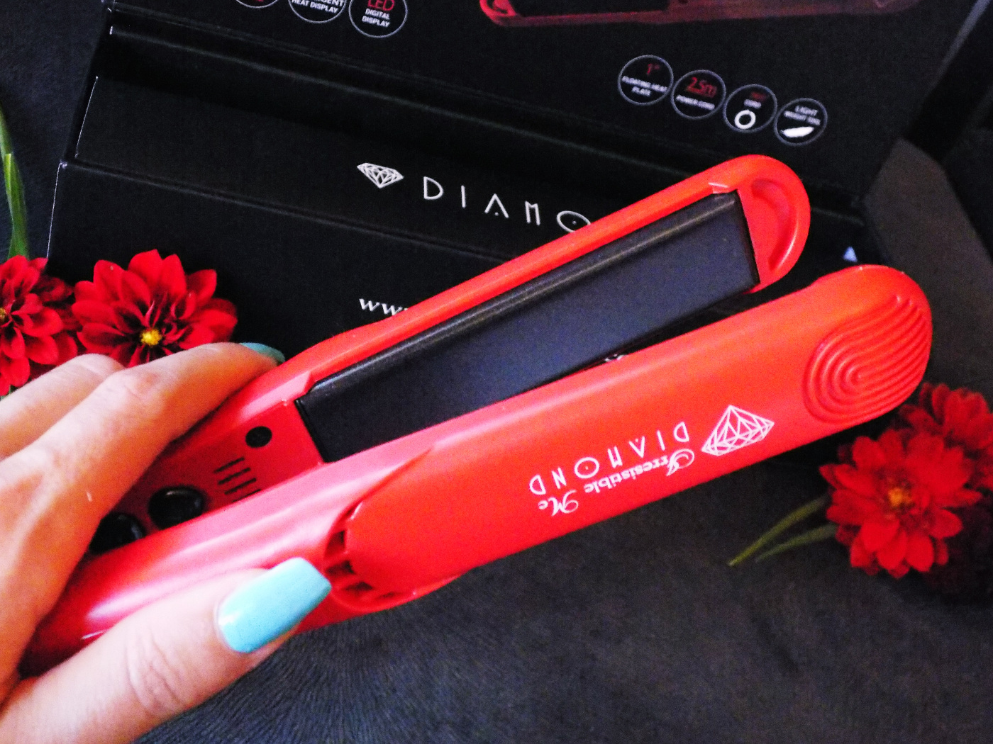 Pierwsze co zwróciło moją uwagę to jej designerski wygląd i piękne logo. Prostownica jest bardzo poręczna i lekka. Ma umieszczony odcisk kciuka, dzięki czemu urządzenie dopasowuje się do dłoni. Przyciski umieszczone są w wewnątrz przez co nie ma możliwości przypadkowej zmiany ustawień podczas stylizacji włosów. Temperaturę można regulować. Dzięki diodom umieszczonym na rączce widzimy jaka jest obecnie ustawiona temperatura. Nagrzewa się od 130 do 230 stopni w bardzo krótkim czasie (ok. 20 sekund). Prostownica posiada fajną dodatkową opcję dla zapominalskich – wyłącza się po 30 minutach od ostatnich zmian ustawień. Kabel jest obracany o 360 stopni i jest dość długi, co bardzo ułatwia stylizacje włosów.