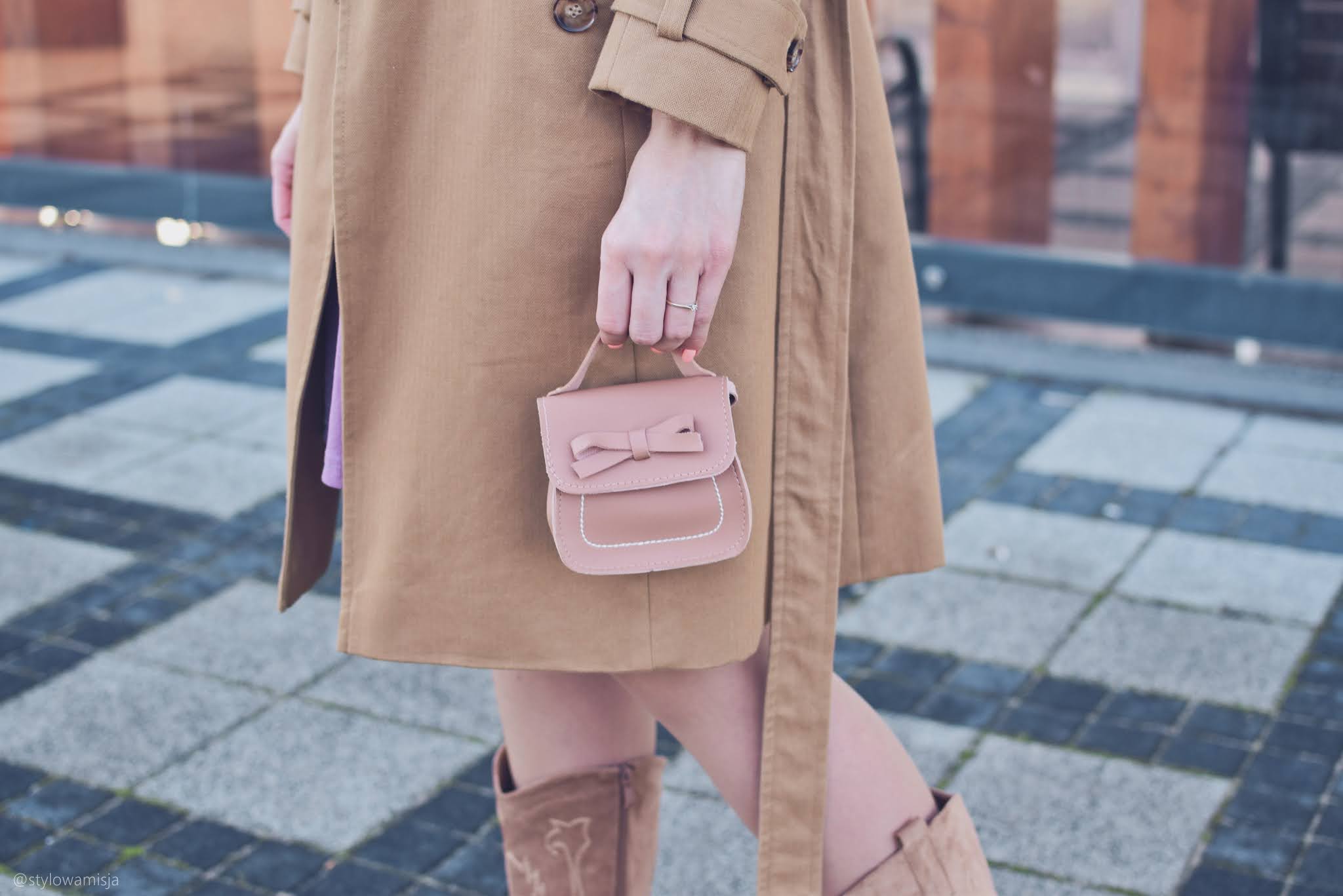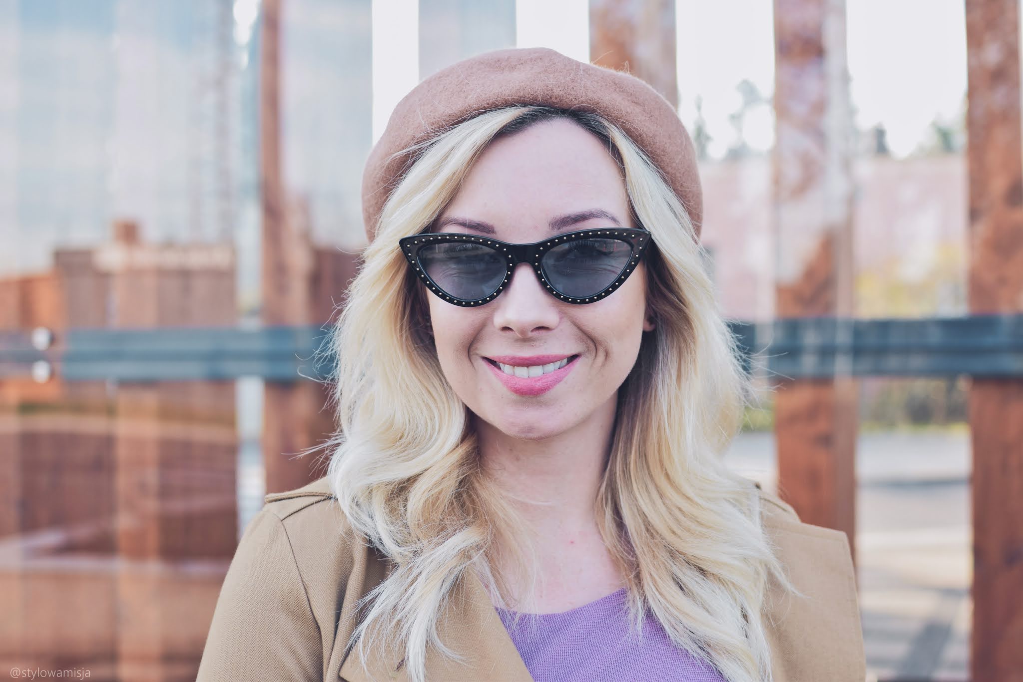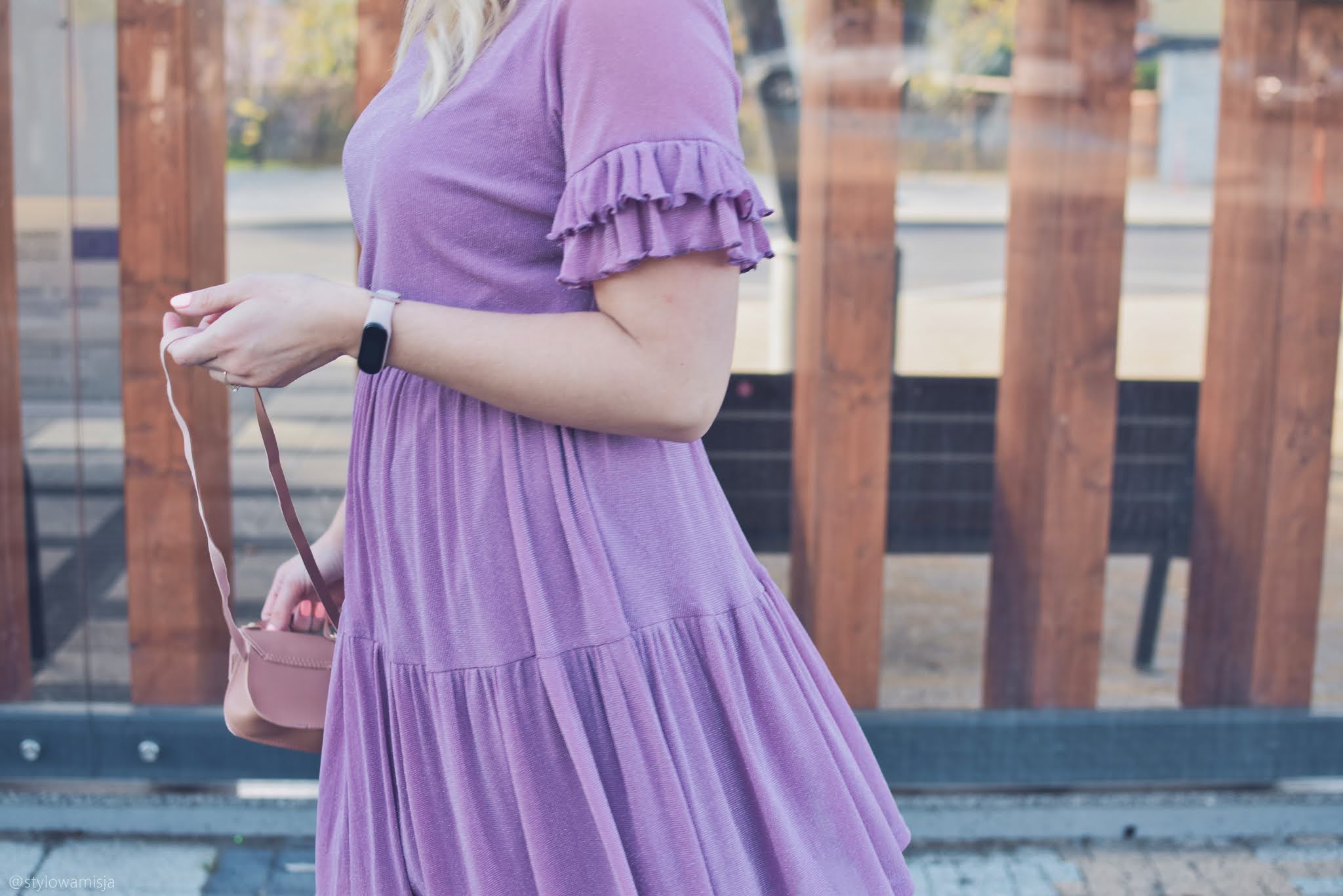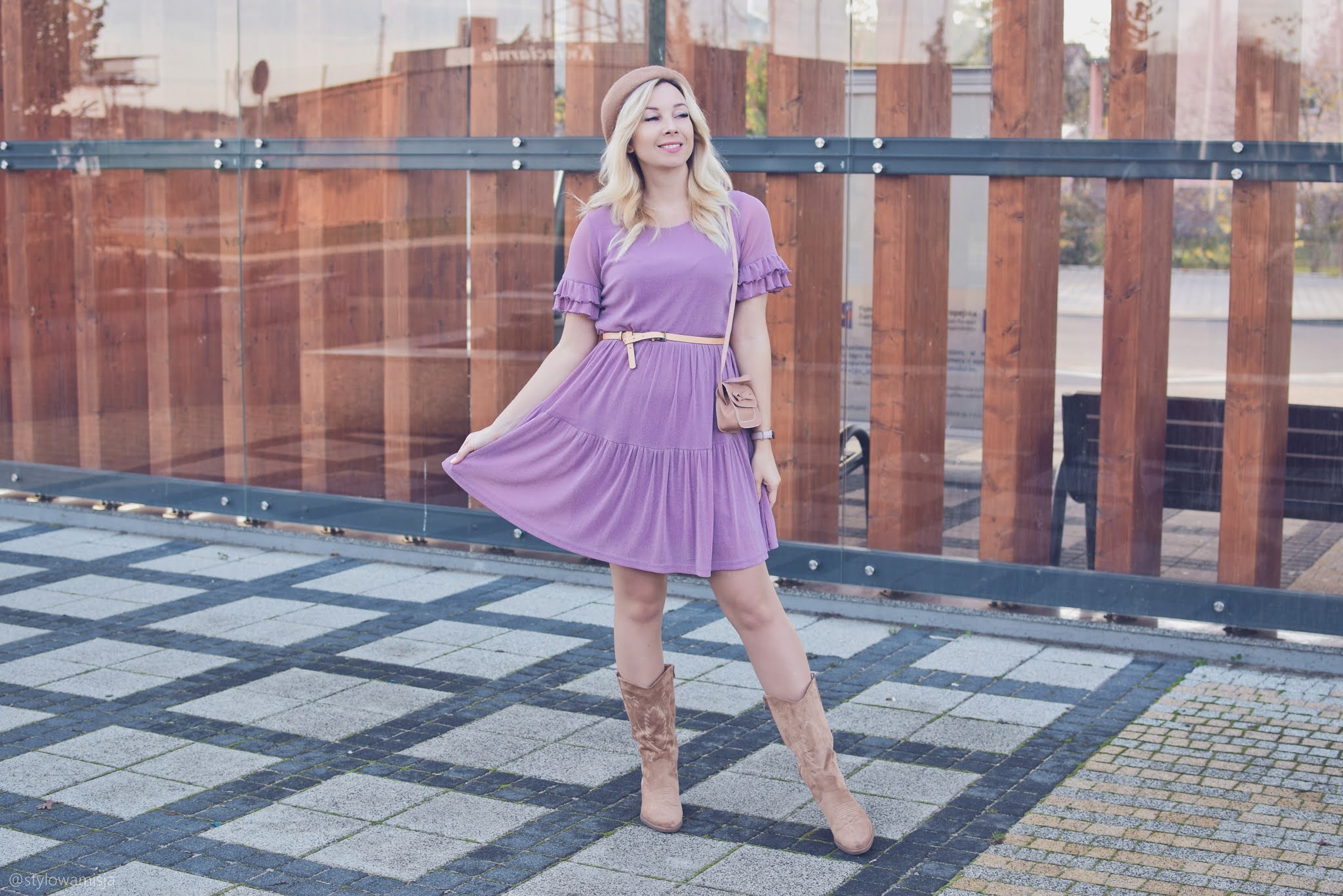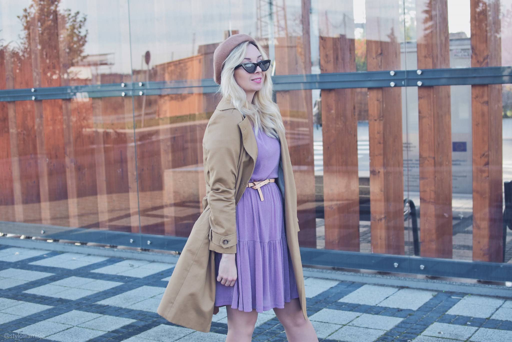 Warto mieć w szafie elegancką sukienkę, którą można wystylizować na wiele okazji. Ja natrafiłam na taką w sklepie odzieżowym online Bon Prix. Szyfonowa liliowa sukienka z falbankami na rękawkach jest oryginalna i bardzo kobieca. Brokatowa, srebrna nitka, którą widać dopiero po bliższym przyjrzeniu jest miłym zaskoczeniem dla oka. W dzisiejszym wpisie wystylizowałam sukienkę w dziennym stylu. Modny beret w karmelowym kolorze zawsze wygląda nietuzinkowo. Niby oczywisty dodatek, ale jednak większość kobiet wybiera klasyczną formę czapki. Kozaki w typie kowbojek nadal nie wyszły z mody, chociaż w obecnym sezonie gonią je botki workery z ćwiekami. Beżowe kowbojki ze sklepu Czas Na Buty zeszłej jesieni nosiłam dosłownie do wszystkiego. Tym razem także zdały egzamin i świetnie wpasowały się w lekki klimat stylizacji. Oczywiście obecnie jest trochę za zimno na krótki rękaw, dlatego warto postawić również na sweter lub narzutkę. Świetnie sprawdzi się długi kardigan w beżowym kolorze. Jako okrycie wierzchnie polecam wybrać trencz, który zawsze wygląda bardzo gustownie. Ja wybrałam polską markę Pro-Be, która tworzy płaszcze z materiałów wodoodpornych. To niesamowite, ale woda naprawdę spływa po tym płaszczu, w który nie wchłania się ani kropelka. Modne i praktyczne zarazem - uwielbiam takie połączenia.