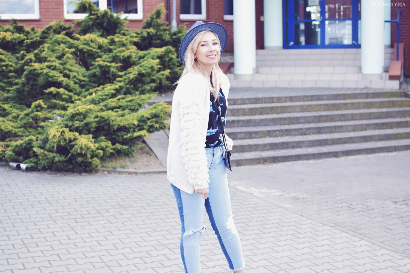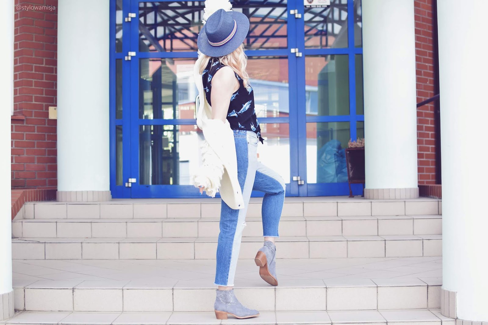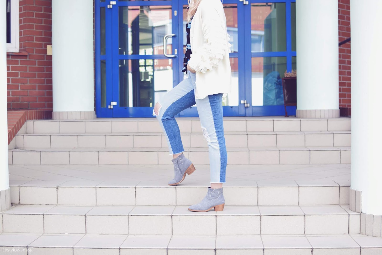 Dzisiaj stylizacja bardzo prosta. Wiosenny look z szarymi botkami w roli głównej. Jak widzicie nie zawiera wielu elementów, a kolorystyka jest stonowana. To wiosenny look dla każdej z nas, która lubi wygodne, acz efektowne stylizacje. Patchworkowe jeansy połączone z krótkimi szarymi botkami to świetne rozwiązanie, kiedy jeszcze nie czujecie się pewnie, by pokazać całe nogi. Mnie nadal przy tej pogodzie jest zimno, dlatego póki co wybieram spodnie z dziurami, by powoli oswajać się z pokazywaniem ciała. Szare botki to buty lekkie i wygodne. Można założyć do nich krótkie skarpetki, lub nosić na gołe nogi. Botki zapewniają komfort w każdej strefie. Do całości dobrałam biały luźny sweter z pierzastymi rękawami, który nadaje całości charakteru. Kapelusz to już oczywistość. Jeśli śledzicie mnie od dawna, wiecie że w większości moich stylizacji znajdują się nakrycia głowy. Uwielbiam je i czuję się w nich pewniej. Dodatkowo w obecnym czasie (jeśli nie skorzystałyście z podziemia fryzjerskiego) kapelusz świetnie maskuje odrosty na włosach.