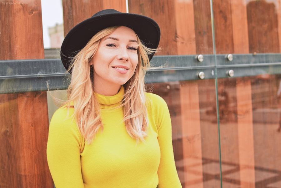 Jak widzicie kolorami przewodnimi są dziś musztarda i czerń. Panterka pojawiła się tu trochę przypadkiem, ponieważ cały czas mi czegoś brakowało. Kamizelka z delikatny wzór pantery od Bon Prix doskonale uzupełniła całą stylizację i dała mi ciepło, ponieważ tego dnia na dworze panował spory chłód. Na nogach mam trójkolorowe czółenka z paskiem w kostce od Czas na Buty, które okazały się prawdziwym zaskoczeniem. Podczas zamawiania byłam przekonana, że takie buty na pewno nie będą leżeć dobrze na moich chudych stopach. Okazało się jednak, że pasują perfekcyjnie i z pewnością przetańczę w nich wiele imprez. Warte uwagi są także cudowna złota bransoletka z charmsami od Dedicante. Marka wprowadziła niedawno gotowe modele bransoletek i drugą opcję, w której sami możemy stworzyć kombinację z charmsów. Wybór jest naprawdę spory. Ja postawiłam na gotową kombinację, która idealnie mi odpowiadała. Bardzo podoba mi się fakt, że na moich chudych nadgarstkach bransoletka leży idealnie. Drugi ciekawy dodatek to torba od Szaleo w czarno-biały wzór golasów. Taka torba będzie idealna na wiosenne spacery. Mimo swojej wielkości, pomieści wiele. Torebka bardzo dobrze nosi mi się trzymana na krótsze uchwyty.