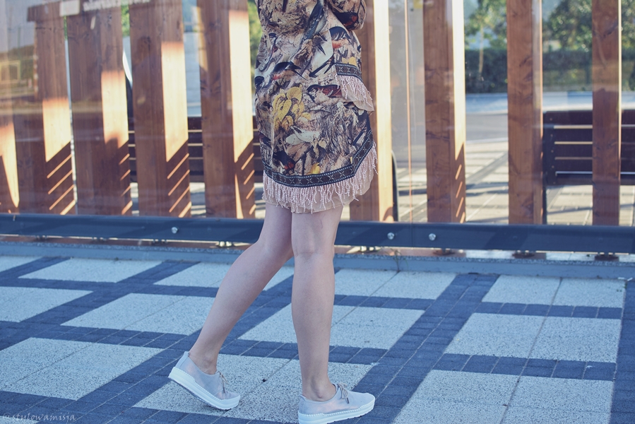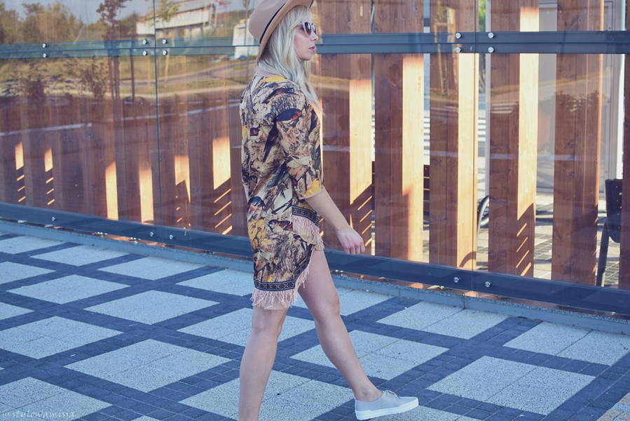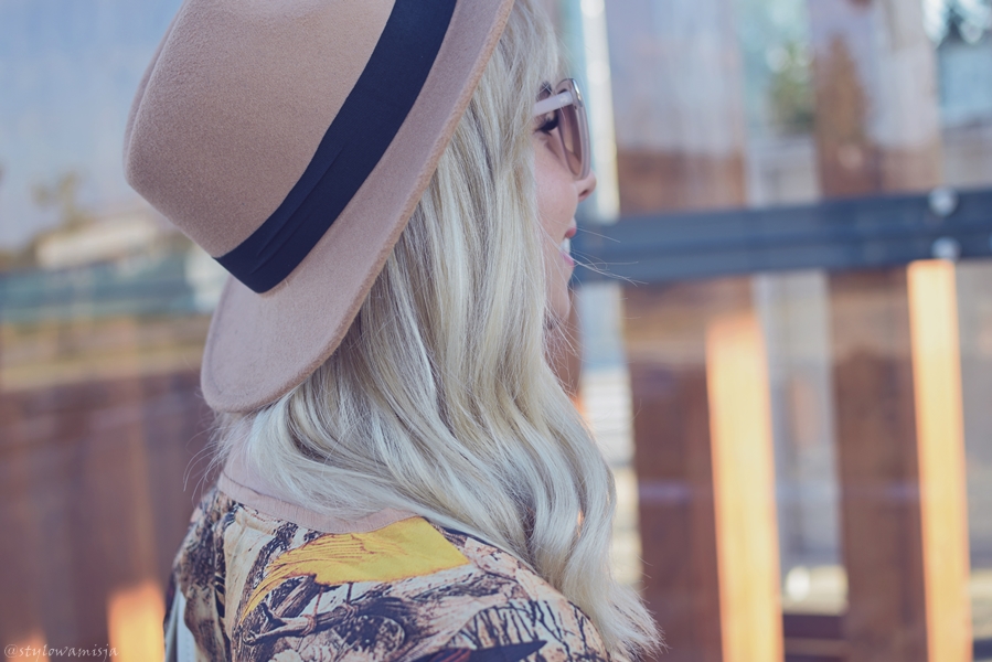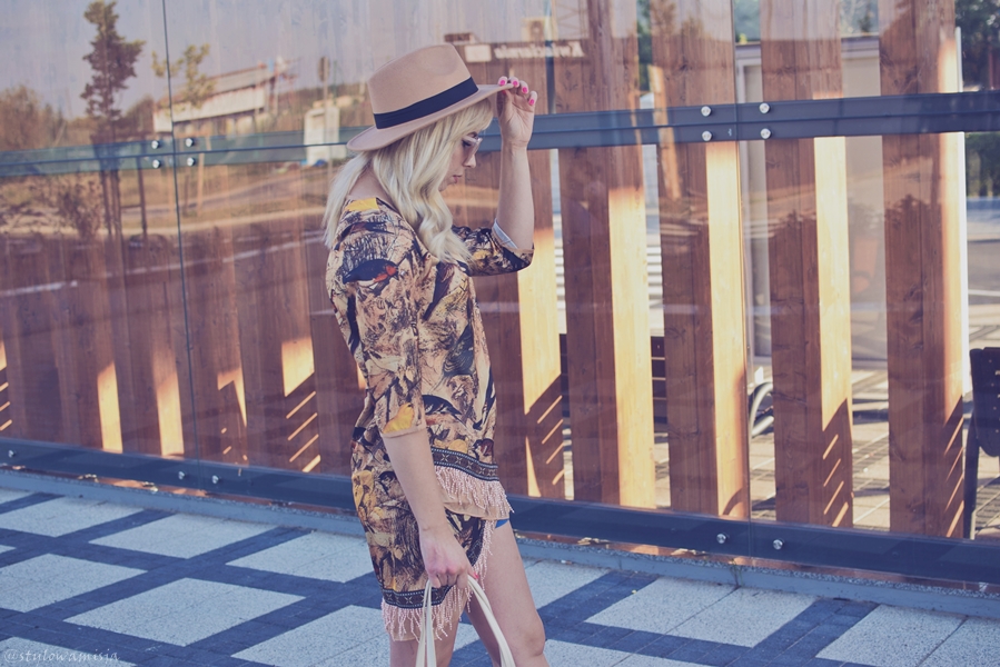 Moja propozycja jest prosta. Dobrze dobrana do sylwetki tunika, spodenki, spodnie, lub legginsy (w zależności od pogody) i wygodne buty. Całość uzupełnijmy plecakiem, lub dużą torbą. Prosto, wygodnie i z efektem. U mnie możecie dziś zobaczyć lekki kolorystyczny misz-masz, który jakoś jednak składa się w całość. Sukienka okazała się być dla mnie tuniką, więc połączyłam ją z krótkimi spodenkami. Do całości dodałam niezwykle miękkie skórzane buty na platformie i dużą torbę z materiału, który (mam nadzieję) przetrwa wiele. Kapelusz i okulary to jak zawsze propozycja dla odważnych i oczywiście nie wyobrażam sobie tych dodatków w supermarkecie. To raczej wariacja na spacer. Lubię jednak pokazać Wam zawsze nieco więcej - takie pozatematyczne smaczki.