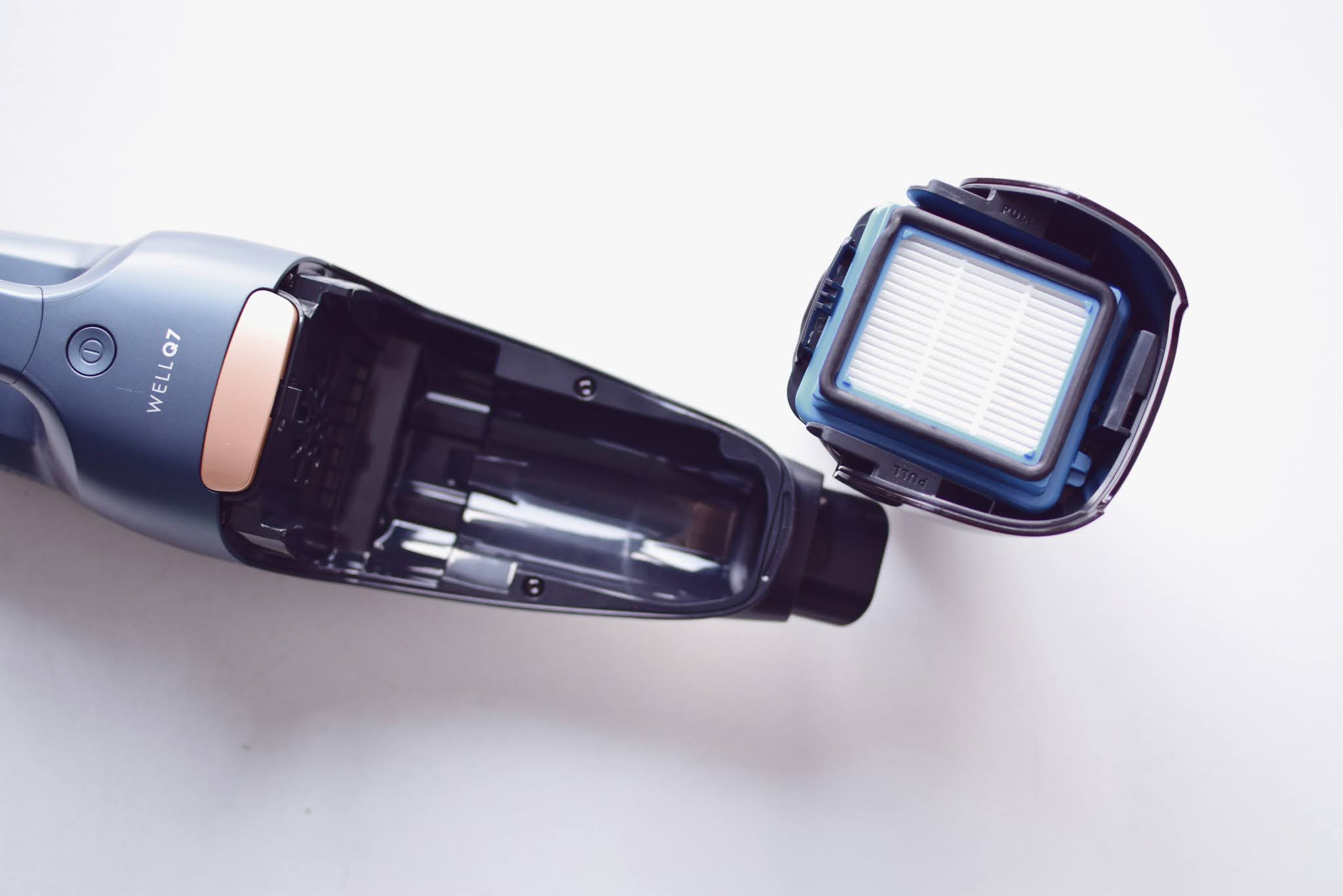 ➽ Pojemnik i jego czyszczenie. Za pierwszym razem musiałam użyć instrukcji (w komplecie duża kartka z obrazkami, która ułatwia korzystanie ze sprzętu) ponieważ nie miałam pojęcia jak dostać się do pojemniczka. Okazało się to jednak bardzo proste i ku mojemu zdziwieniu w środku nie było filtra, który muszę najpierw obrać z brudu, by wyczyścić resztę. W odkurzaczu bezprzewodowym Well Q7 wystarczy wysypać kurz z pojemnika i po sprawie. Bardzo pozytywne zaskoczenie. Dodatkowo sprzęt posiada także pięć stopni filtracji, co bardzo czuć (a raczej nie czuć) podczas sprzątania. Jeśli jesteście alergikami na kurz i roztocza, ten sprzęt będzie idealny dla was. Zero odczuwalnego kurzu na każdym etapie użytkowania.