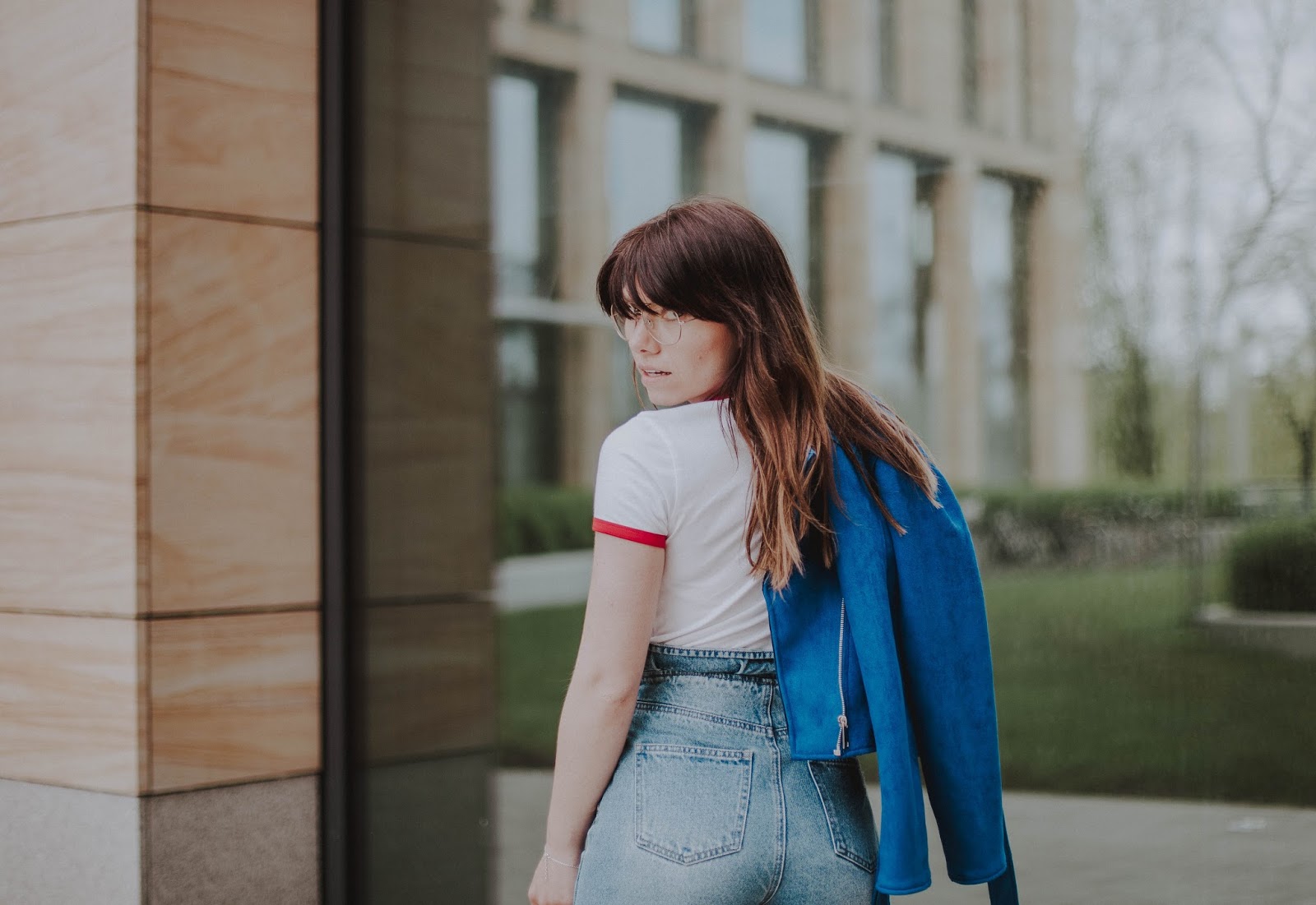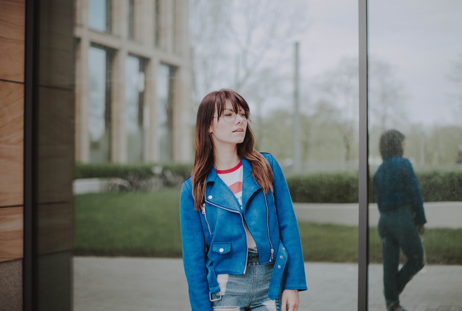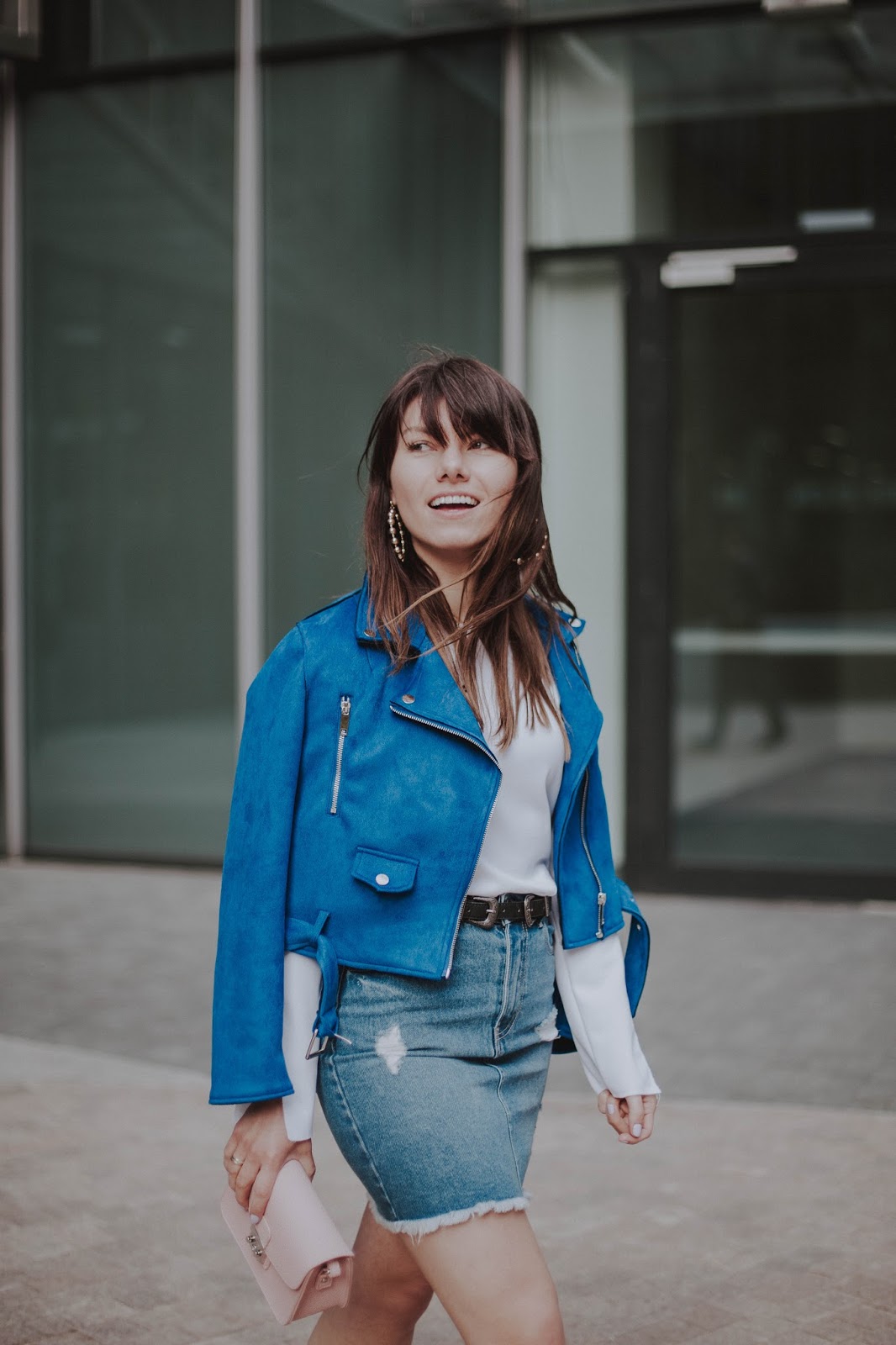 W obydwu stylizacjach postawiłam na kolor niebieski w różnych odsłonach w połączeniu z bielą. Te kolory świetnie do siebie pasują, tworząc spójną całość. W pierwszej stylizacji prosta bluzka zestawiona z lekko przetartą spódnicą - klasyka. W te dwie rzeczy można zaopatrzyć się w polskich sieciówkach. Różowe buty od Renee nadają elegancji. Idealnym dopełnieniem całej stylizacji stanowi niebieska ramoneska.