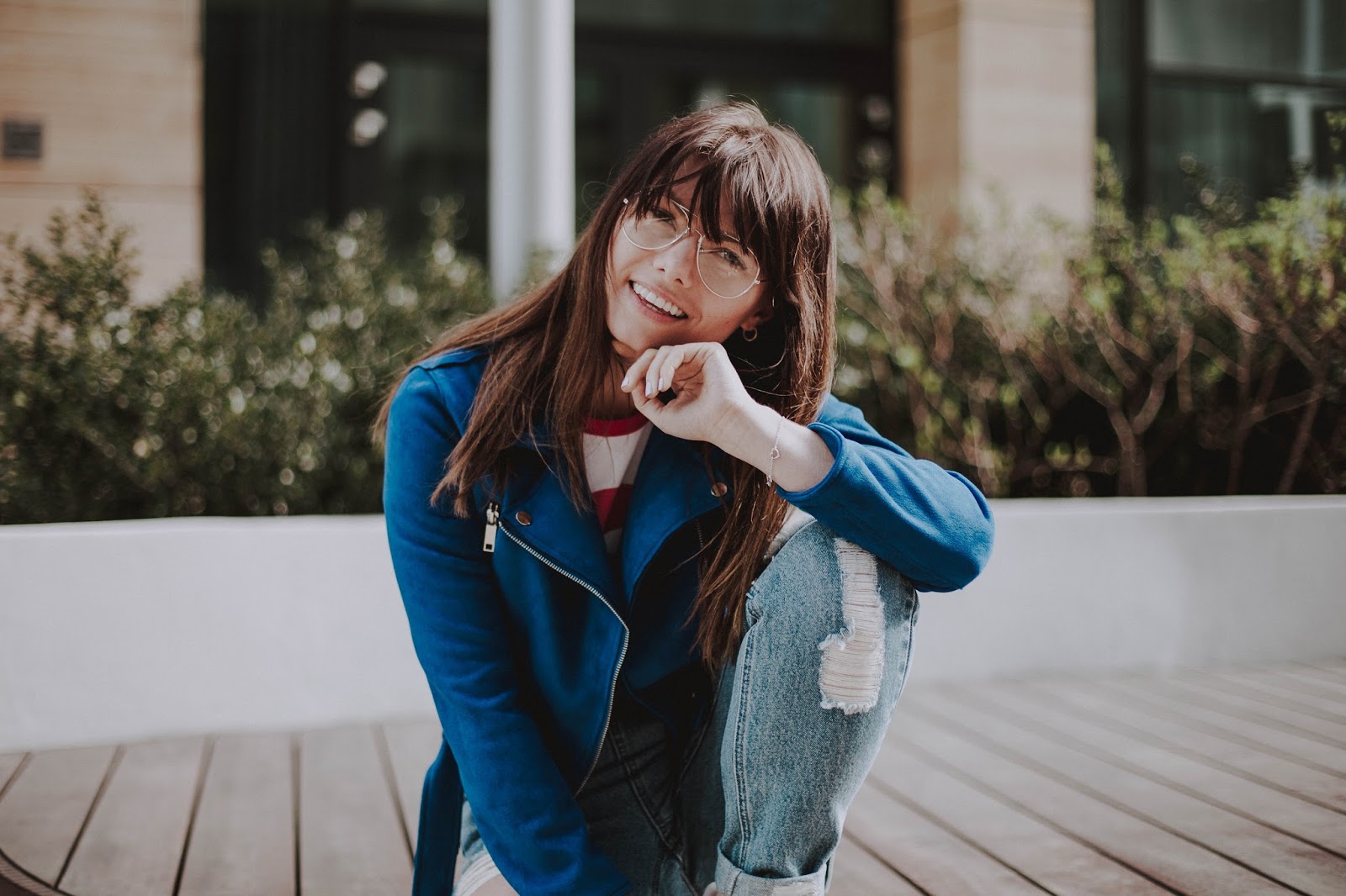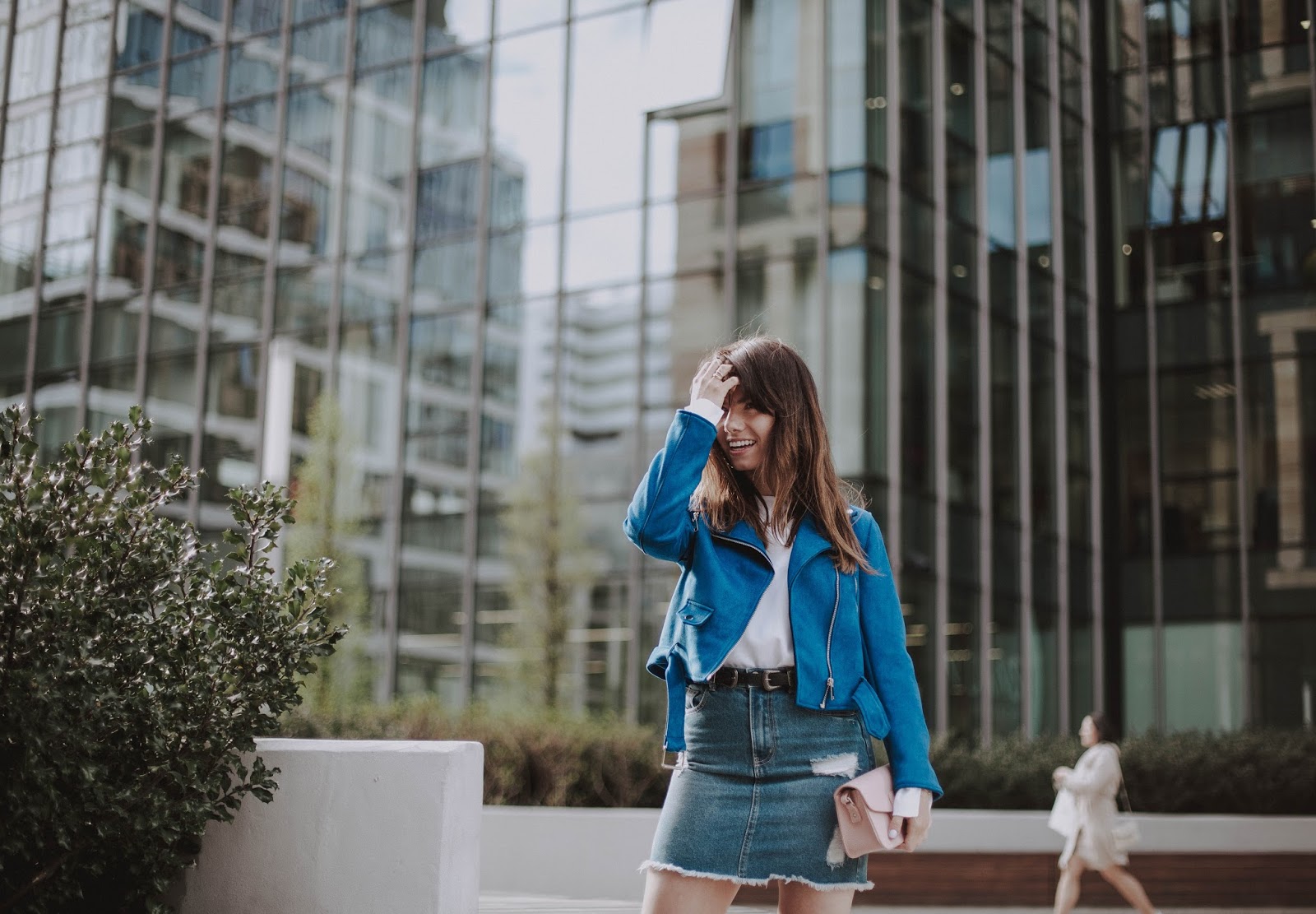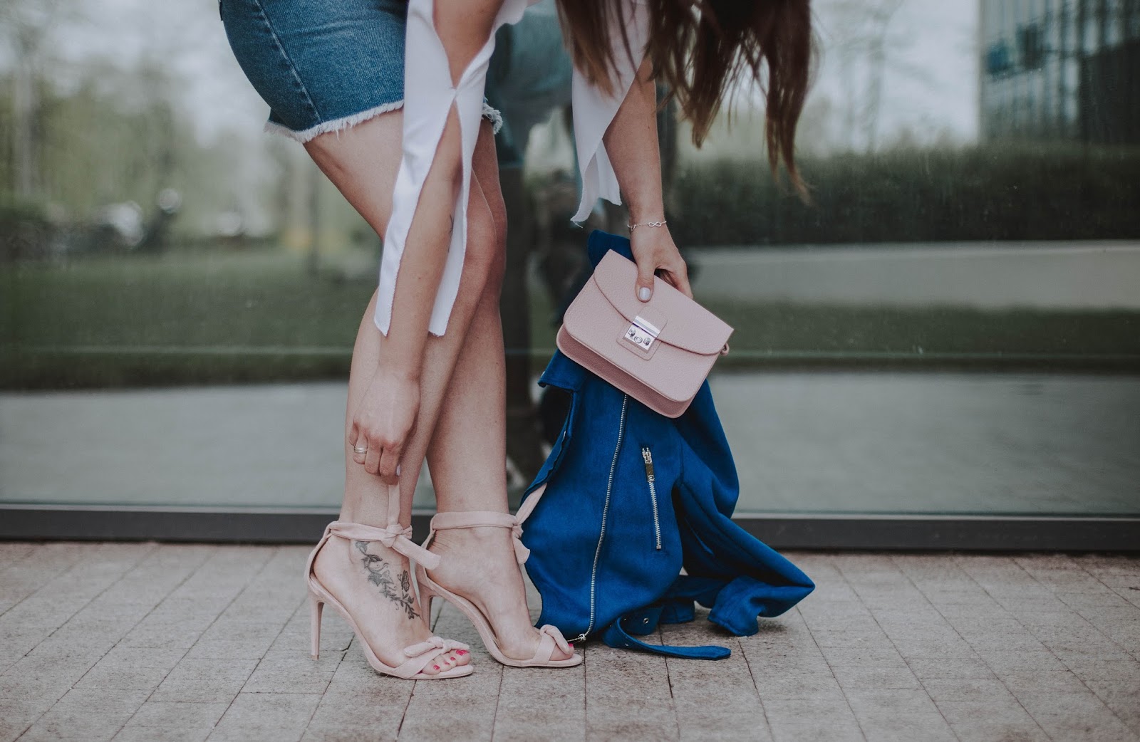 W obydwu stylizacjach postawiłam na kolor niebieski w różnych odsłonach w połączeniu z bielą. Te kolory świetnie do siebie pasują, tworząc spójną całość. W pierwszej stylizacji prosta bluzka zestawiona z lekko przetartą spódnicą - klasyka. W te dwie rzeczy można zaopatrzyć się w polskich sieciówkach. Różowe buty od Renee nadają elegancji. Idealnym dopełnieniem całej stylizacji stanowi niebieska ramoneska.