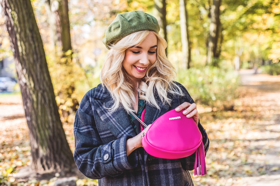 Stylizacja prezentowana wśród jesiennego, parkowego krajobrazu to look osadzony w bieżących trendach. Oversize'owy płaszcz w modną kratę od Pro-be i sukienka w zielono-fuksjowe liście z obniżonym stanem marki Emoi tworzą interesującą całość, która jednocześnie daje nam wiele swobody i ciepła. Pragnę pokazać, że łączenie różnych wzorów może być świetną zabawą i w efekcie podarować nam ciekawy efekt.