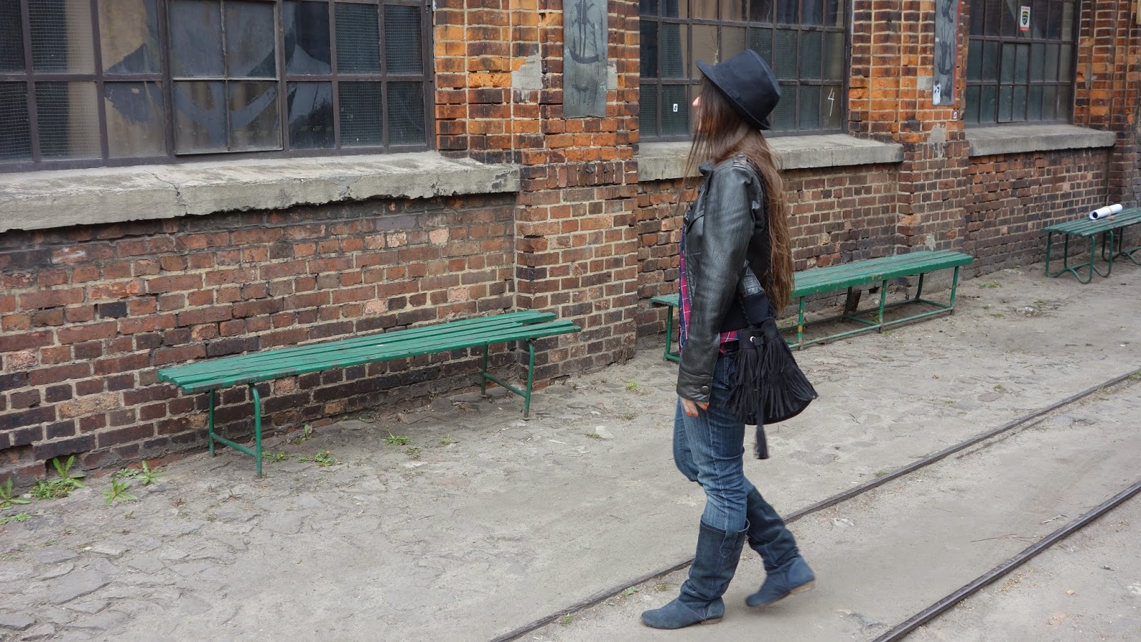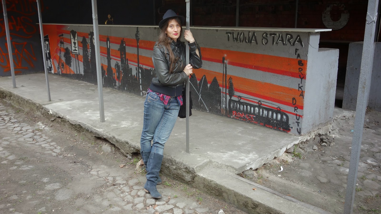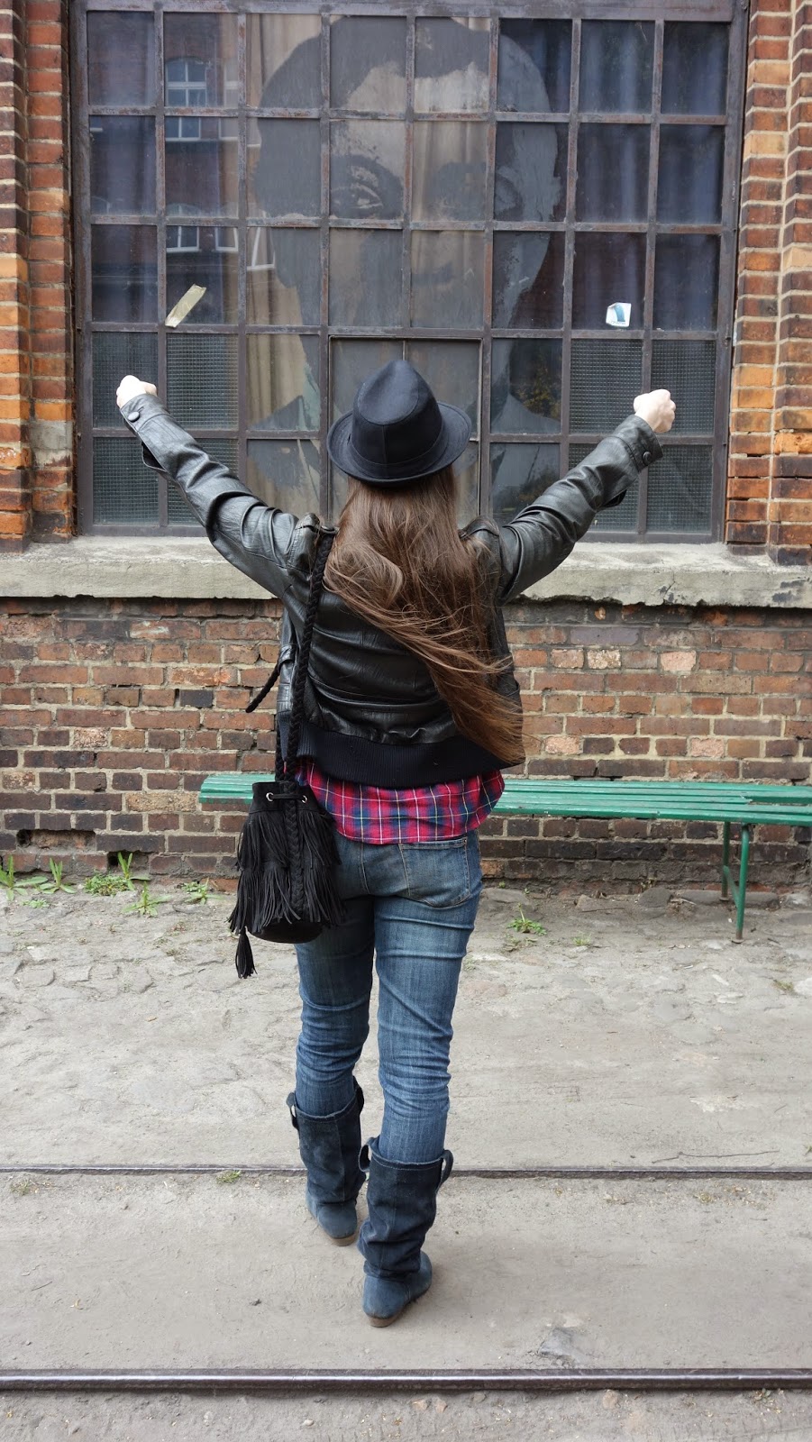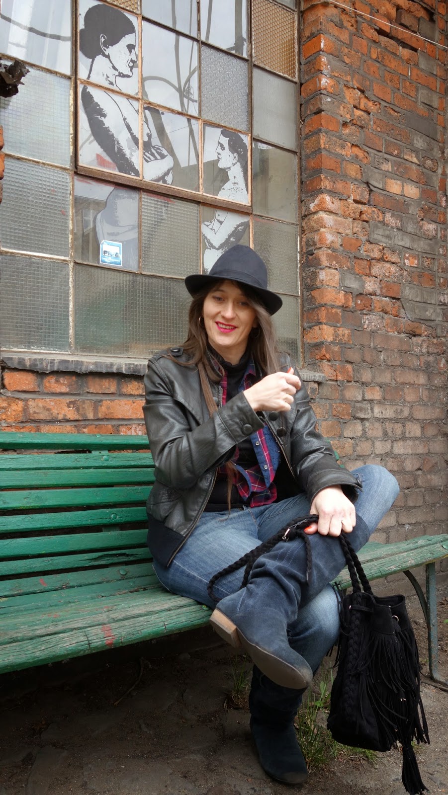 Tak jakoś wyszło, że pogoda pokrzyżowała mi plany w sobotę, i zamiast sesji w owocowych kwiatach była sesja w Starej Fabryce Drutu. Było zimno, wiało, przelotnie śniegiem sypało, ale wstyd w końcu bo wiosna, nie łamiemy się i nie wskakujemy w barchany!!! Postanowiłam wykorzystać okazję. Przypuszczałam, że w dniu kiedy w Gliwicach organizowana jest impreza halo!gen teren fabryki będzie otwarty, i uda się tam cyknąć kilka klimatycznych fotek, no i był. Zestaw to taki mój częsty mundurek „koncertowo-festiwalowy”, inspirowany grungem, bo mam sentyment. Wytarte spodnie, kraciasta koszula, bo wygodnie. "Cebulka" na całodniowym festiwalu się przydaje - popołudniu gdy żar leje się z nieba krótki rękawek, lub top, a im bliżej nocy, tym więc na mnie warstw:). Buty płaskie, bo na koncertach lubię poskakać to raz, a dwa łatwiej niż obcasach uniknąć po piwie stanu nieważkości. HD-ków nie noszę już od lat, chociaż dopiero w zeszłym roku zdecydowałam się na ich całkowite usunięcie z szafy. Skórzana kurtka - mam ją od 2008 roku, i nie rozstanę się nią póki będzie dychać! Widziała ze mną kilka OFF Festivali, i jeszcze parę innych,mniejszych, wielokrotnie bywała w Fabryce Drutu, wycierała się po pubach. Jest moją drugą skórą. Kapelutek na dodatek, na koncertach bardziej mi przeszkadza niż pomaga, no ale ma ten plus, że chroni przed Słońcem, i fajnie wygląda :D, a worek z frędzlami - nowy nabytek z H&M. Całość nieszczególnie wyszukana, pomieszana w stylach, ale taka moja, swojska.
