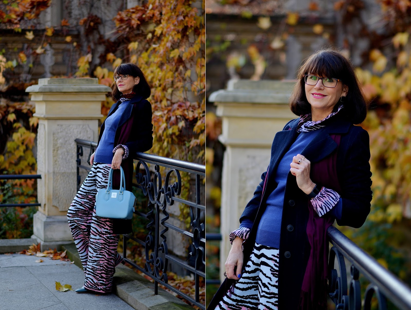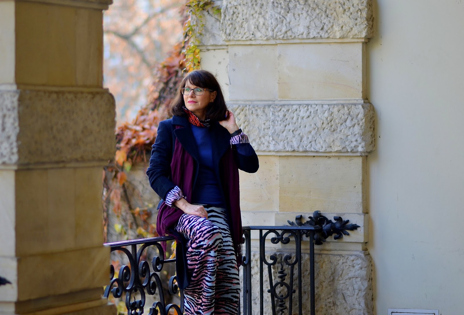 Do spodni założyłam koszulę również z tej kolekcji, która ma taki sam wzór co spodnie na wewnętrznych częściach kołnierzyka i mankietach. Całość stonowałam prostym, jasno granatowym sweterkiem. Do tego klasyczny płaszcz w ciemnym granacie i bordowy, jednolity szal. W ten sposób ujarzmiłam "tygrysa"! ;D