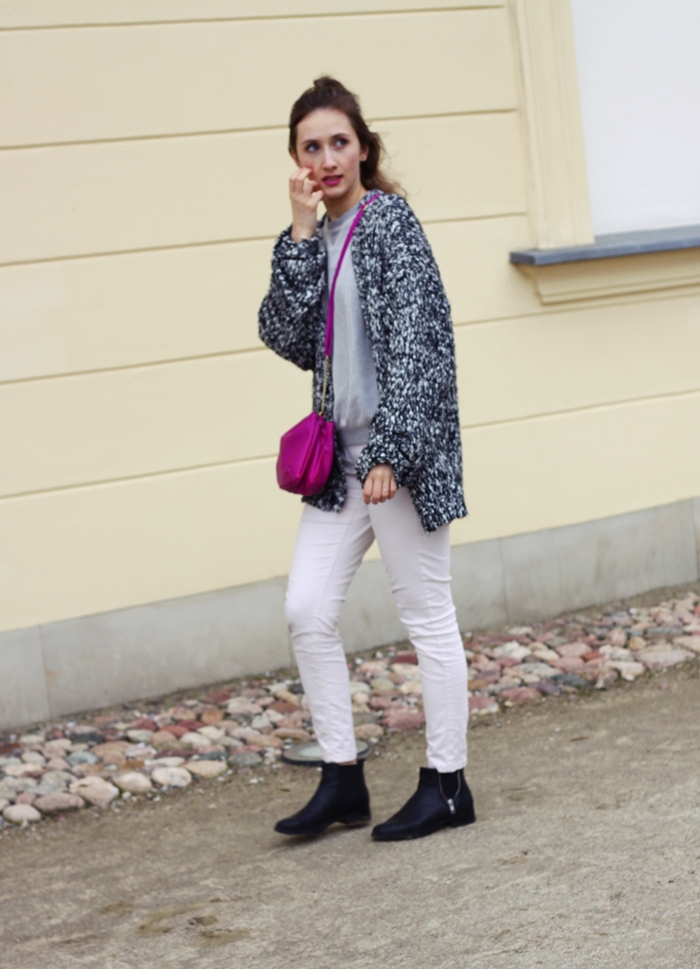A co do stylizacji: sweter z kurtką i paznokciami tworzy całkiem mocny blok, który przełamuję szarością i żółcią. Torebka to zamierzony akcent, ożywiający całość. Tym razem rolę świecidełek spełniają Rumcajsy (kolczyki), które wnoszą odrobinę koloru i błysku w okolicach twarzy w towarzystwie koralowej szminki ;)