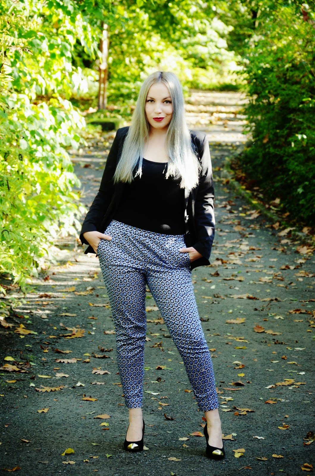 Rzadko ubieram się naprawdę elegancko. Zazwyczaj jest to związane z sesją na uczelni bądź jakimiś uroczystościami. Ale chyba zaczynam się przekonywać do granatowych wzorzystych spodni 7/8, które jak widać nawet z marynarką mogą wyglądać i elegancko i fikuśnie zarazem.