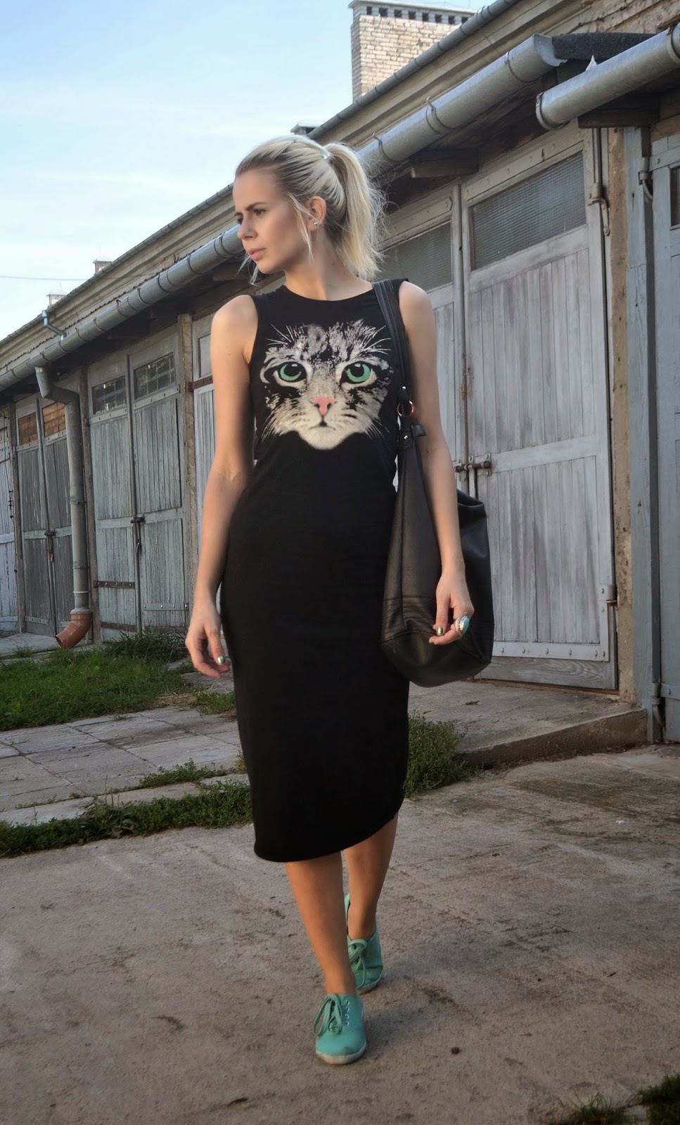 Dzisiaj kolejne cudeńko z Lovelyshoes.net .Sukienka ma słodki nadruk, poza tym jest idealnie obcisła i zrobiona z milutkiej bawełny. Niestety nie była na dole podłożona, przez co w trakcie chodzenia materiał zwijał się w rulonik, ale już to naprawiłam po prostu ją podszywając . Ta kocia kiecka jest idealna na co dzień w cieplejsze dni i w te chłodne w zestawieniu ze skórką i botkami.