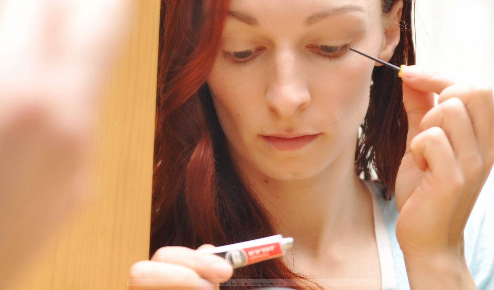 Opakowanie nie zachwyca jakością , ale już jego zawartość tak. Nakrętka tubki jest wyposażona w patyczek, którym nakładamy produkt. Kolor uzyskany - mocna czerń. Takim to mało profesjonalnym sprzętem nauczyłam się rysować jaskółki na powiekach :D