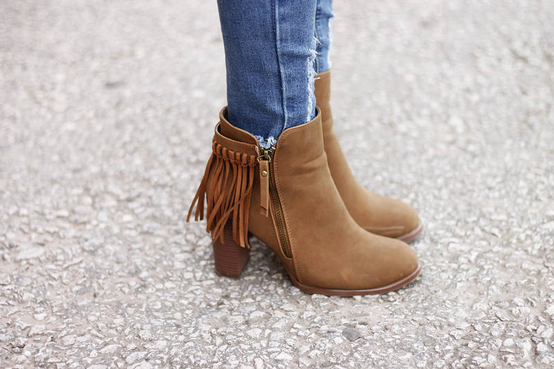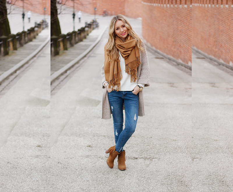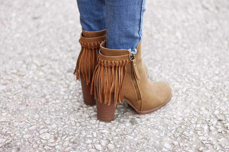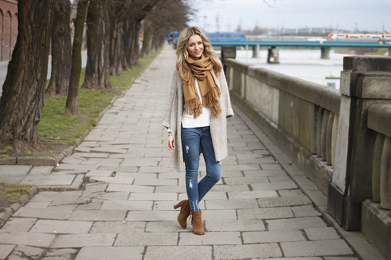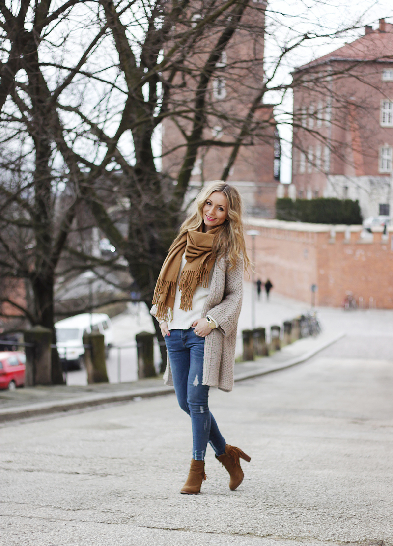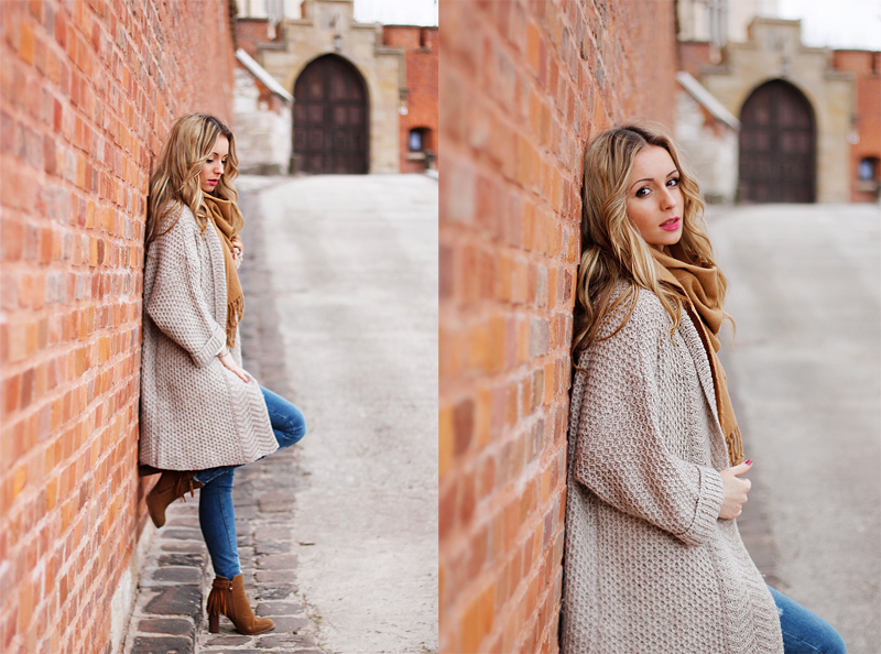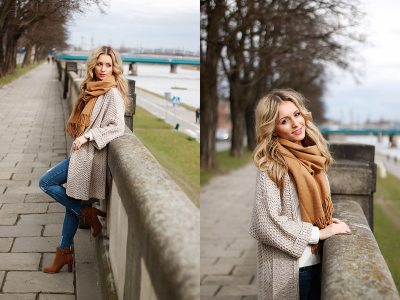 Całość uzupełniłam ceglastym szalem i botkami zdobionymi frędzelkami w stylu boho.