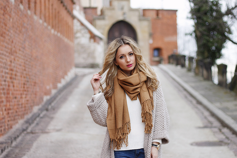 Prosta stylizacja w moich ulubionych beżach i rudościach, gruby, pleciony, oversizowy sweterek połączyłam z klasycznymi rurkami.