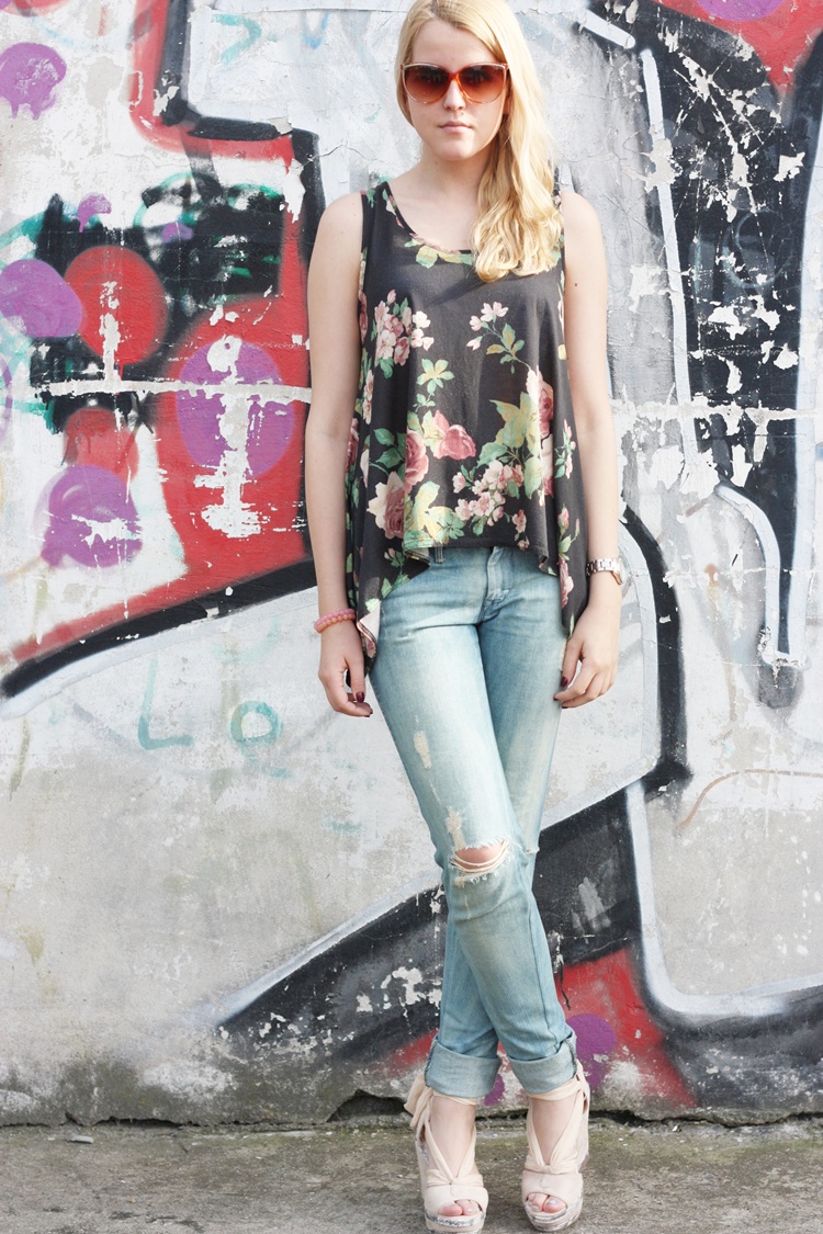 Kwiaty, my kobiety lubimy je dostawać, ale lubimy je też nosić. Kwiatowy print modny jest praktycznie cały rok. Kwieciste sukienki, legginsy, t-shirty i tuniki. Jestem na tak! W bukiecie kwiatów na ciuchach odnaleźć można róże, maki, albo tulipany. Kwiaty to podstawa stylu romantic, dlatego do mojej tuniki założyłam koturny nude inspirowane baletem.