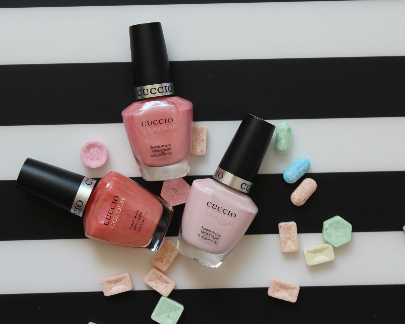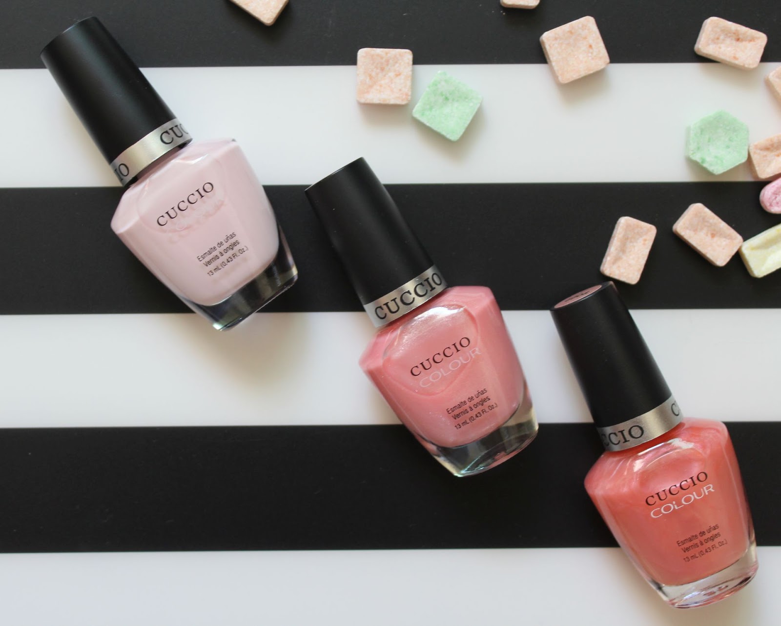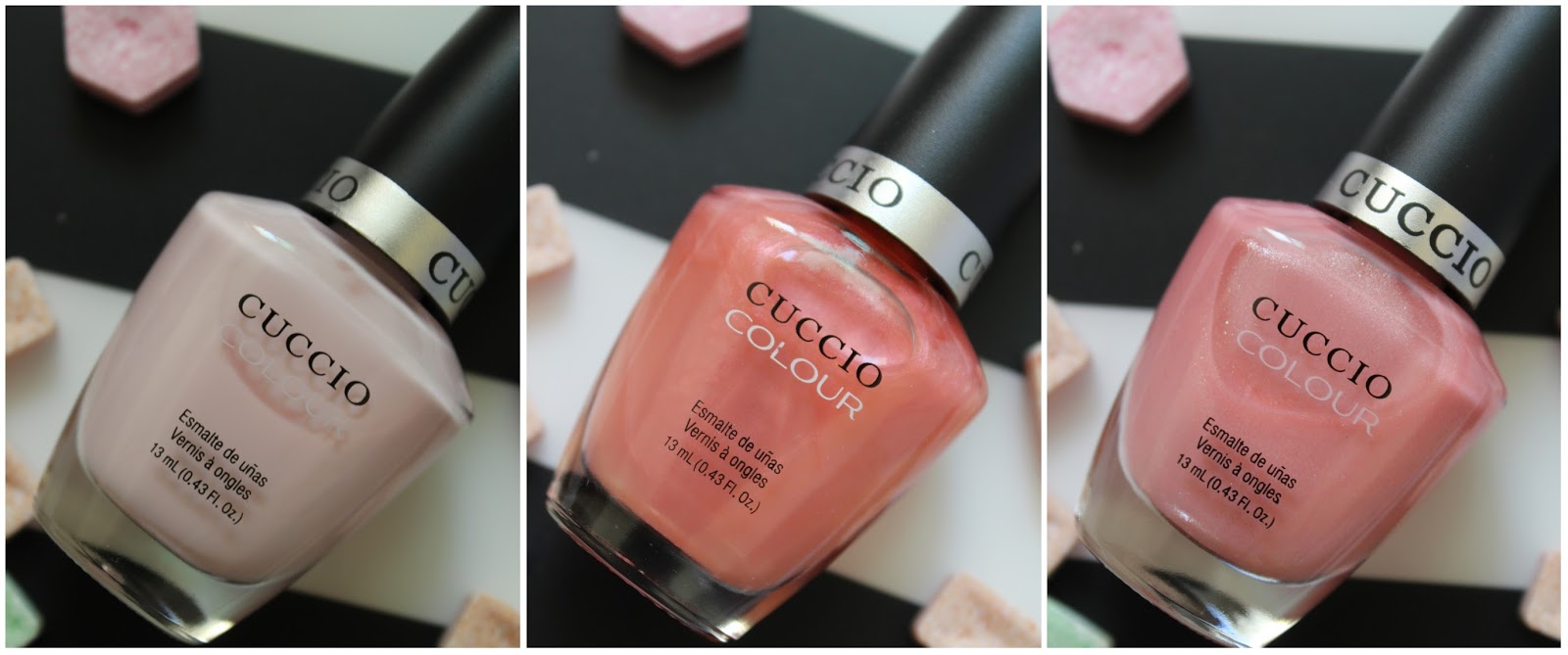 Nowy miesiąc, nowy tydzień i nowy post. Dzisiaj Lakiero- mania z naszymi ulubieńcami Cuccio. Nie wiem czy już wiecie, ale niestety (nadal rozpaczam z tego powodu), nie mogę malować paznokci do pracy na różne piękne kolor, błyszczące, migoczące itp- dozwolone mam tylko czerwienie, nude i pudrowe róże. Dlatego z Cuccio tworzymy małą 'pracowniczą armię'. Dzisiaj jej pierwsza odsłona, cukierkowe odcienie różu, w których udało mi się przemycić delikatny szimerkowaty błysk ;)