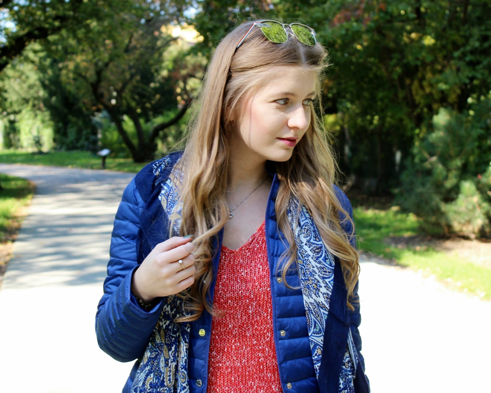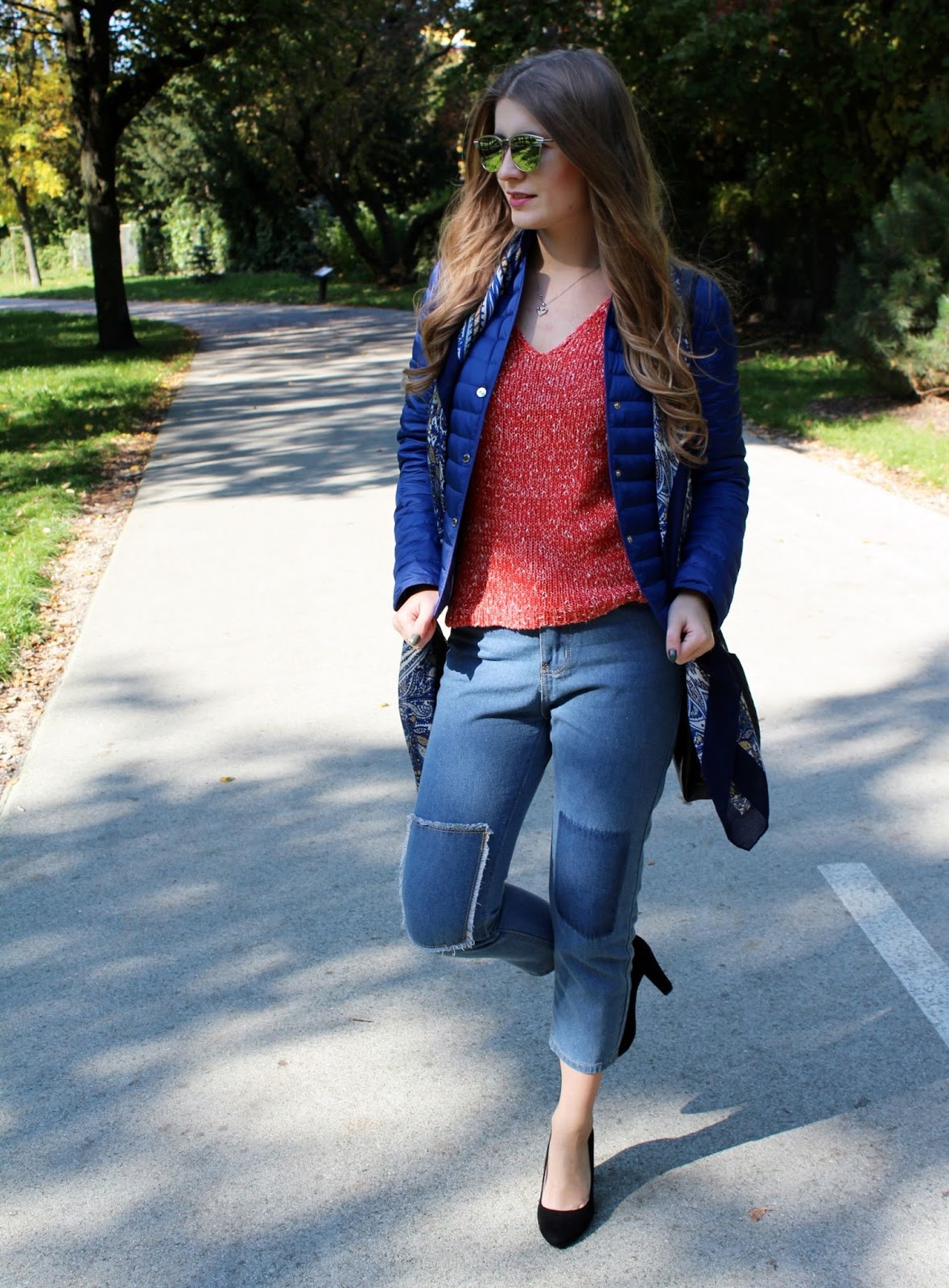 Typowo jesienny look- lekka, puchowa kurteczka- jedna z moich ulubionych w szafie, jest w formie marynarki, przez co pasuje do wszystkiego. Dobrałam do niej, krótkie, miękkie i wygodne jeansy ROMWE, od dawna szukałam jeansów z łatami, najlepiej kontrastującymi. Te idealnie wpisują się w poszukiwany wzorzec. Do całości, kontrastujący, mocno pomarańczowy sweterek.
