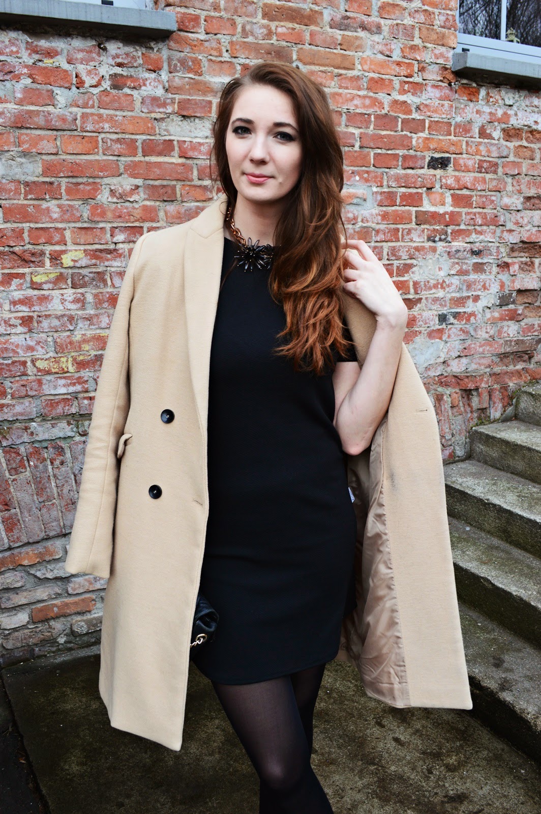 sukienka-nn, płaszcz-Reserved, naszyjnik-Mohito, torebka-second hand, buty-Deichamnn