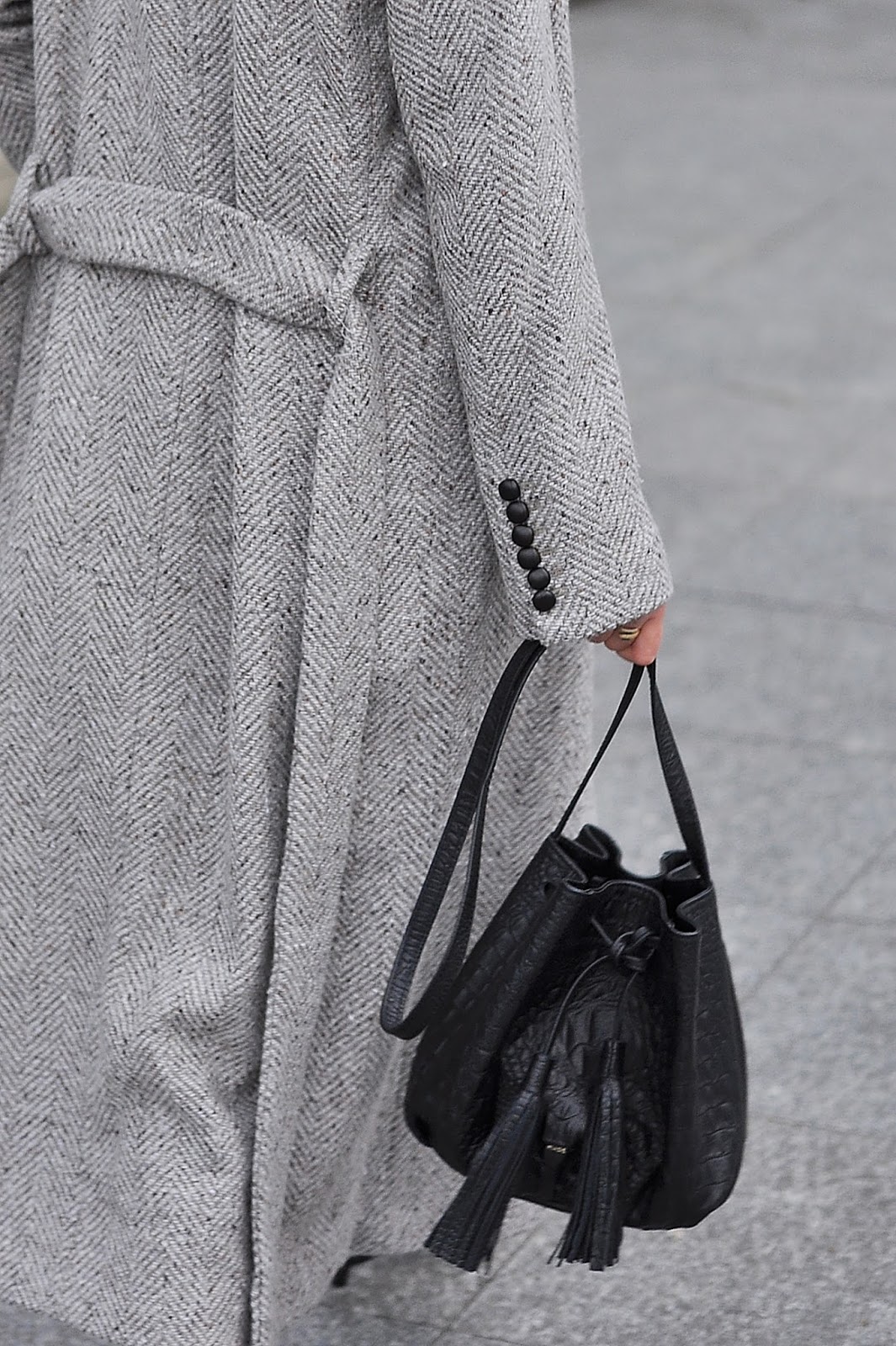 Mój ulubiony obecnie krój zimowego płaszcza? Koniecznie wełniany, wiązany w pasie, na wzór kimona/szlafroka, o klasycznej długości sięgającej za kolano, do tego szerokie klapy i obszerny, sztormowy kołnierz. Wszystkie te cechy spełniał pewien model z zeszłorocznej kolekcji Mango Premium. Niestety, jak to zwykle bywa w sieciówkach, pojawienie się niebywale interesującego produktu wiąże się zazwyczaj z jego szybkim zniknięciem z magazynowych stanów. Mija dokładnie rok i ku mojemu zaskoczeniu płaszcz znów się pojawia, tym razem w ofercie outletowej sklepu Mango. Pomimo tego, że jego dostępność na stronie ulega ciągłym zmianom, finalnie udaje mi się upolować najbliższy mojemu rozmiar i zakupić go z praktycznie 70% zniżką. Uwielbiam takie okazje :)