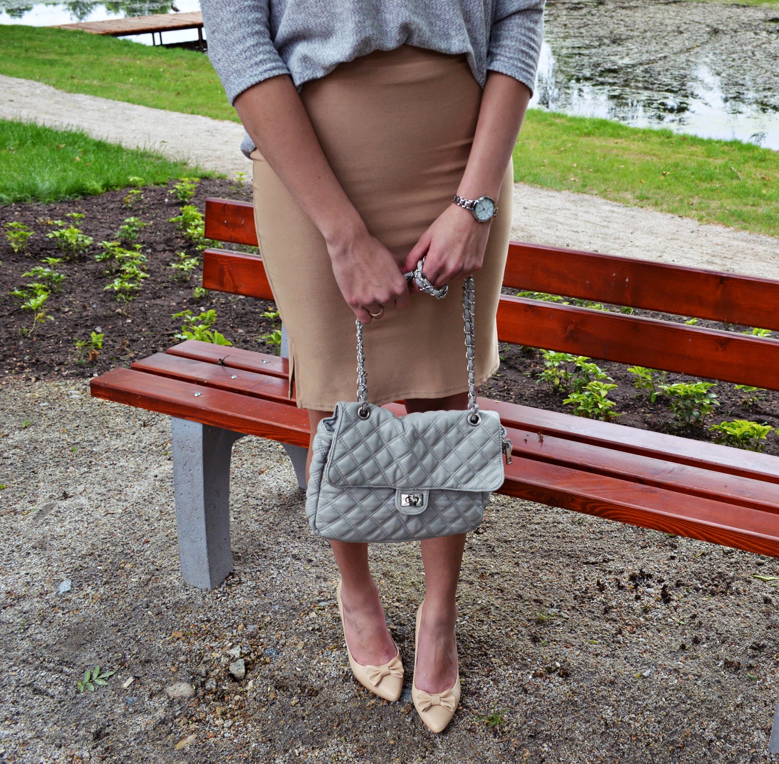 Lubię proste zestawy, które z powodzeniem można wykorzystać podczas wielu okazji. Niewątpliwe ten dzisiejszy do takich należy. Wystarczy mała wymiana dodatków np. ze szpilek na baleriny, czy trampki, aby móc wybrać się w niej na zakupy. W ostatnim czasie polubiłam zakupy w lokalnych sklepach. Można w nich znaleźć za naprawdę niewielkie pieniądze fajne ciuchy. Sweterek ze zdjęcia kosztował 33 zł, a spódnica upolowana w sh zaledwie 8zł. Beż, szarość oraz srebro to niewątpliwie jedno z moich ulubionych zestawień kolorystycznych. Co sądzicie o tej stylizacji?