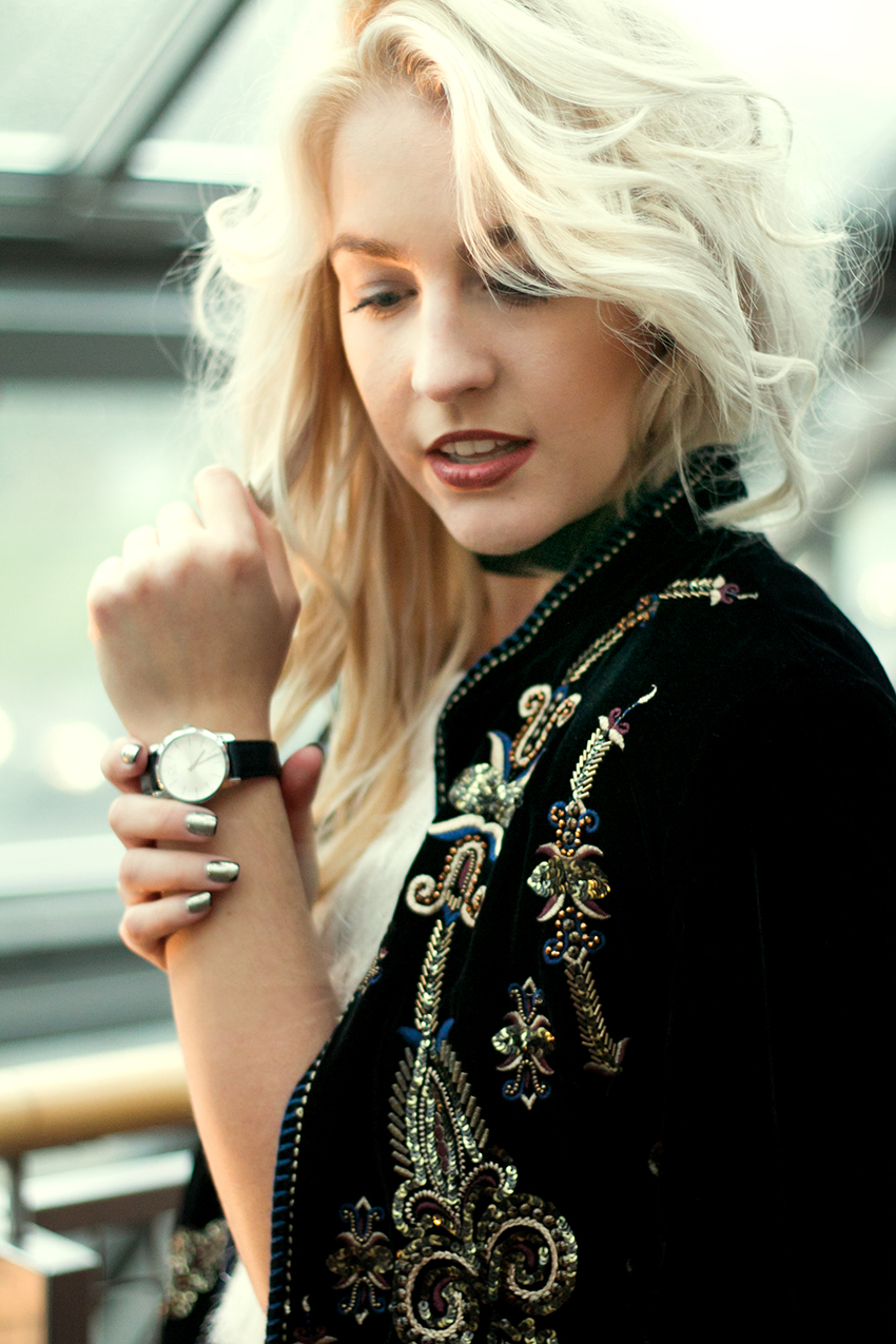 fot. Dominika Pietrzybajacket, top Zarawatch Calvin Klein skirt Mohitotights Calzedoniashoes River Islandchoker Stradivarius