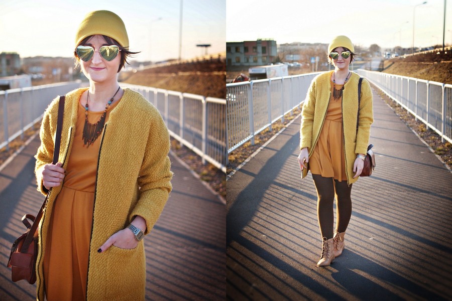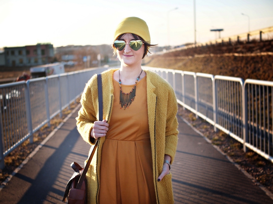 Zobacz oryginał czw., 02/03/2017 - 21:29Po czarno-biało-szarych paskach przyszła kolej na coś co lubię najbardziej- kolor. Trochę monotematyczny dziś ten żółty: sukienka, płaszcz i czapka. Jednak żółć w innych tonacjach więc nie jest chyba nudno, zresztą to przecież kolor słońca i nadchodzącej wiosny i lata na który tak czekamy.