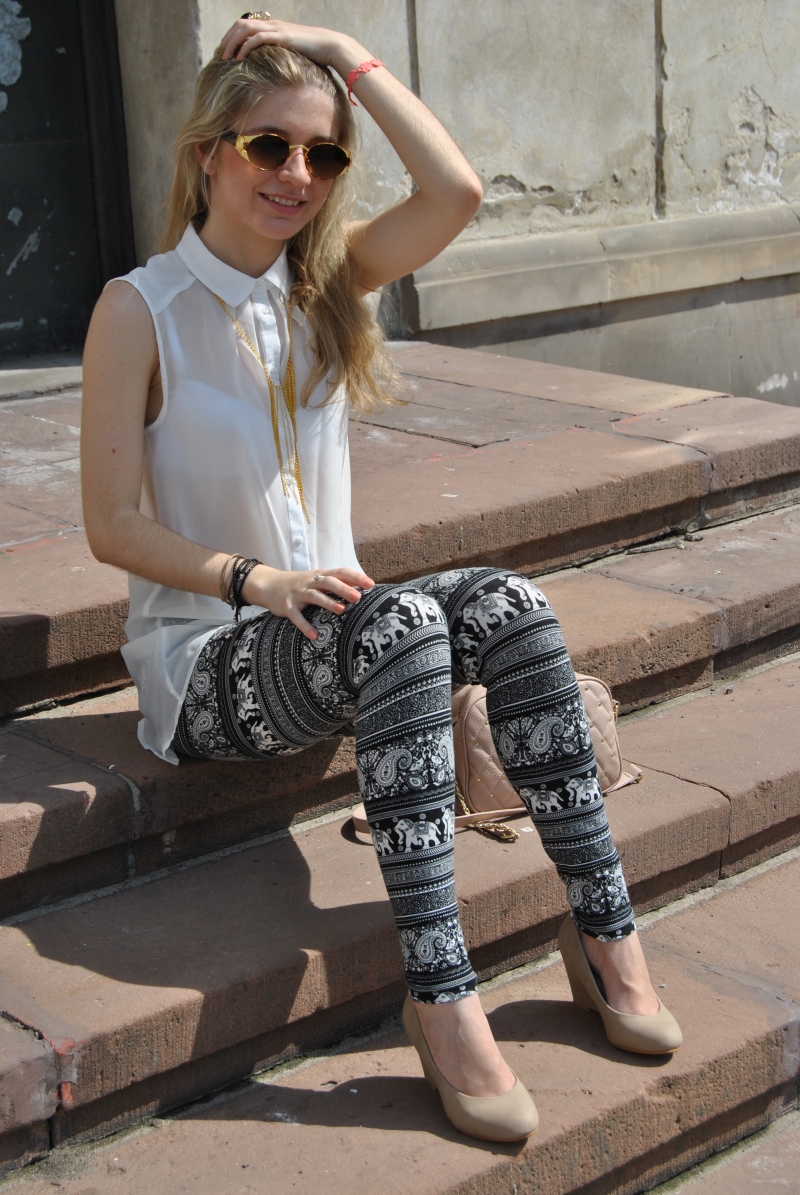 Shirt: H&M; Leggins: Stradivarius; Bag: Atmosphere; Ring: KappAhl; Sunglasses: vintage (borrowed); Necklace: Czarna Biedronka; Shoes: Czas na buty