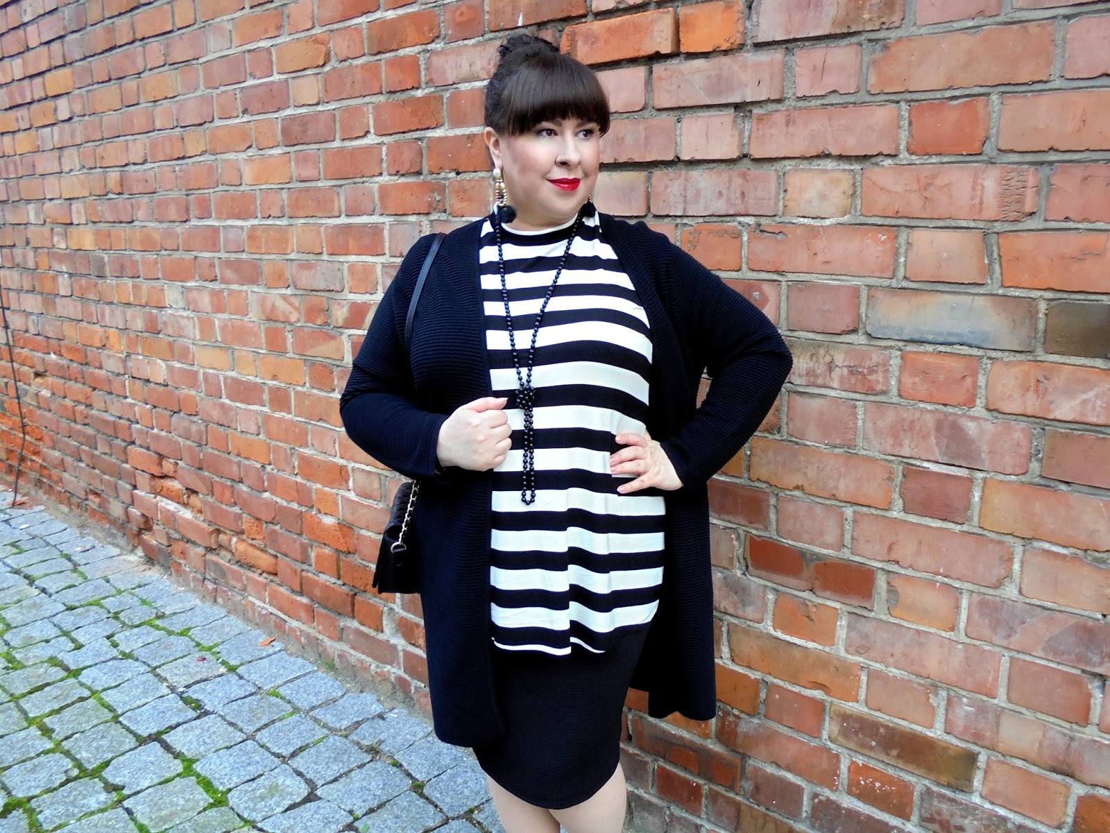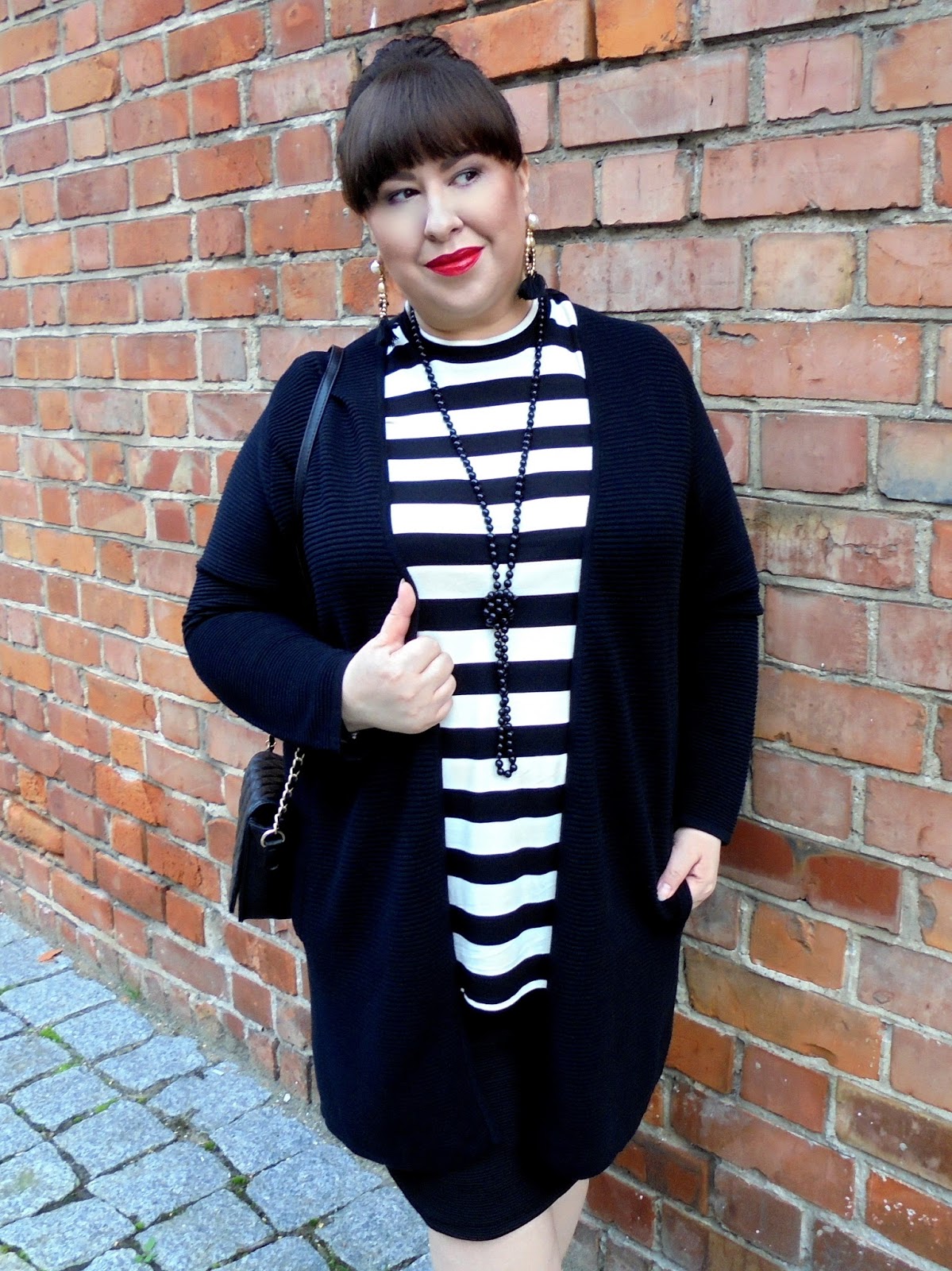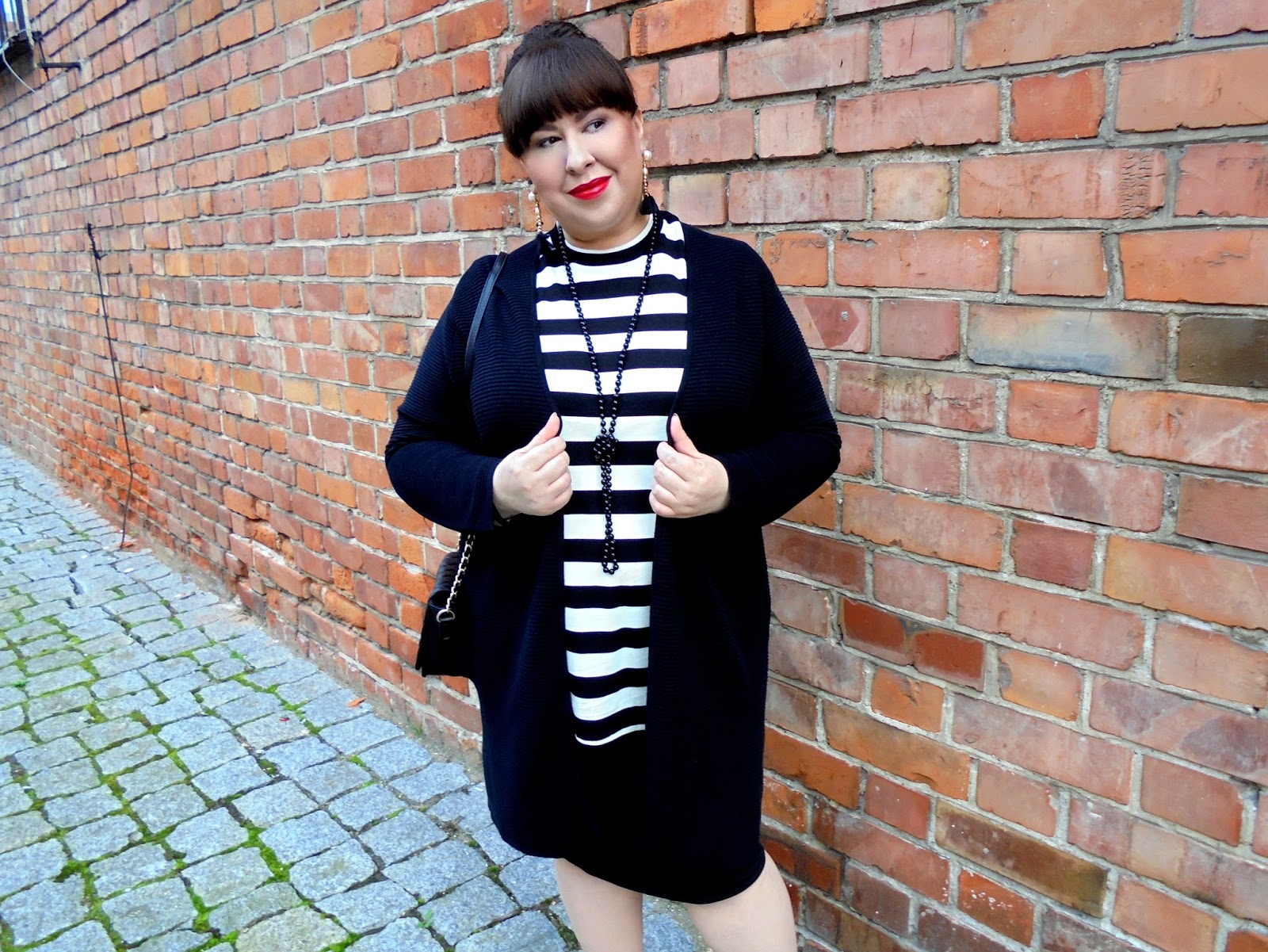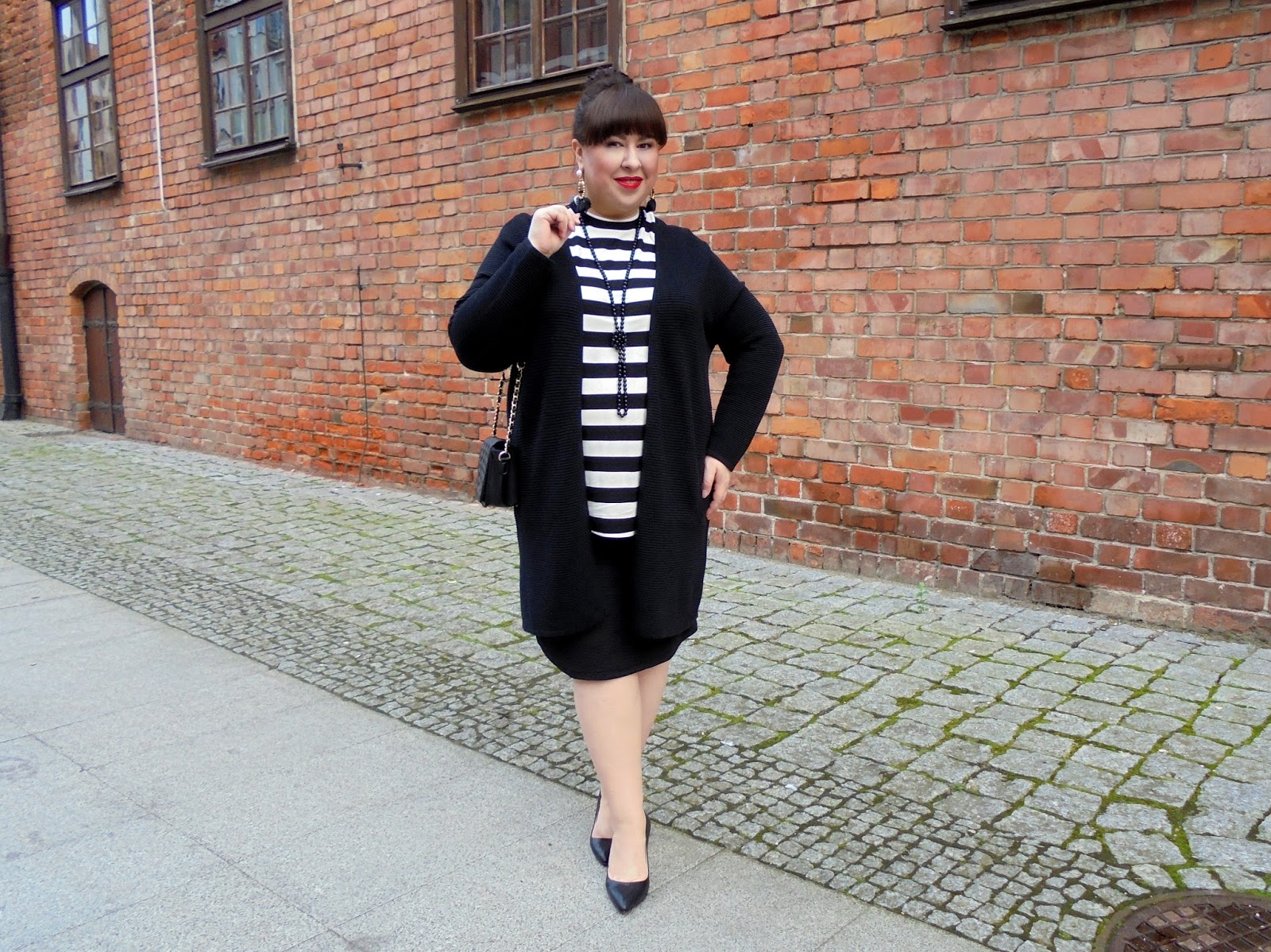 Moim okryciem wierzchnim jest DŁUGI SWETER z dzianiny w prążki.