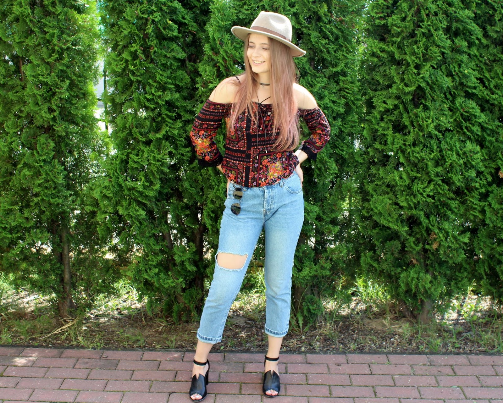 Zmiana stylu jest czasami potrzebna, może być długotrwała, może mały element, który odświeży Nasz dotychczasowy styl, albo stylizacja, która zmieni Nasz nastrój, poprawi samopoczucie. Moim dzisiejszym umilaczem czasu i humoru jest delikatne boho, które stworzyłam dzięki bluzeczce z odkrytymi ramionami od Bon Prix, którą charakteryzują nie tylko ramiona czy wiązanie na dekolcie, ale przede wszystkim wzór. Do tego okrągle okulary od Kodano i jeansy z wysokim stanem i ozdobnym, wyszywanym pasem. Wykończeniem całości jest choker od Iwony Piecuch i czarne sandałki na słupku.