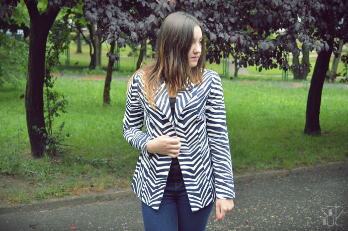 Nie chciałam kolejnego nudnego żakietu w szafie, który kojarzy mi się tylko z egzaminami. Materiał bawełniany w biało-granatową zebrę kosztował mnie 15 zł za półtora metra. Już w sklepie wiedziałam co z niego powstanie.