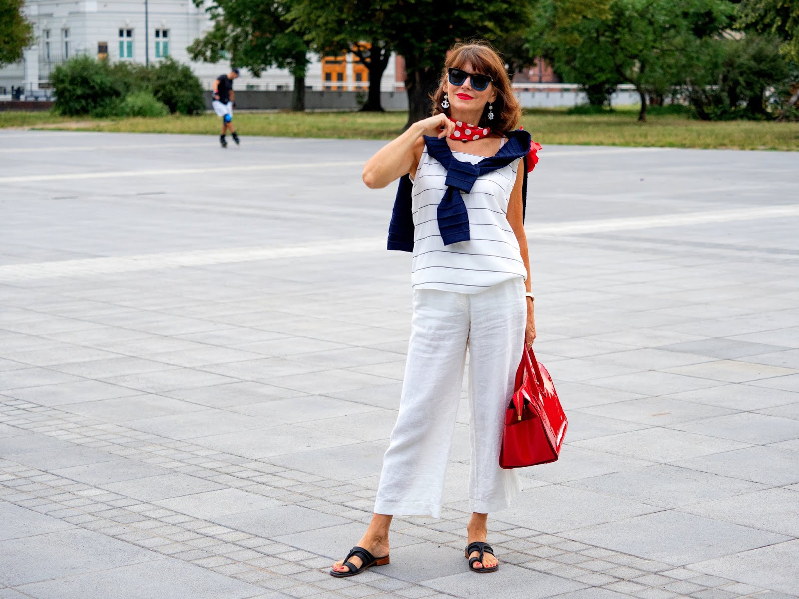 Tym razem postawiłam na bardzo luźny, sportowy strój, w marynarskim stylu. Można powiedzieć, że to wakacyjna klasyka: lniane, białe, nieco przykrótkie spodnie, do tego prosty top w delikatne paski i granatowy sweterek. Uwielbiam granat i uwielbiam sweterki a ten, niby taki prościutki ale bardzo intrygujący - ma bardo ładny, łódkowaty dekolt, który zagabnie podkreśla walory dekoltu i szyi, delikatny a jednocześnie efektowny wzór i z tył urocze zapięcie na kokardkę.