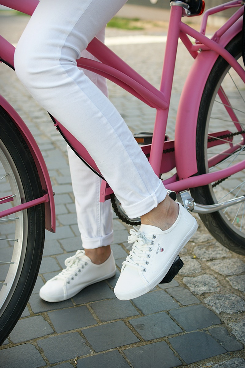 Podczas jazdy na rowerze najlepiej sprawdza się obuwie sportowe. Tym razem wybrałam białe tenisówki marki GANT. Ten model sprawia, że stopy wyglądają smukło, zaś biały kolor jest idealny na wiosenno-letni czas.