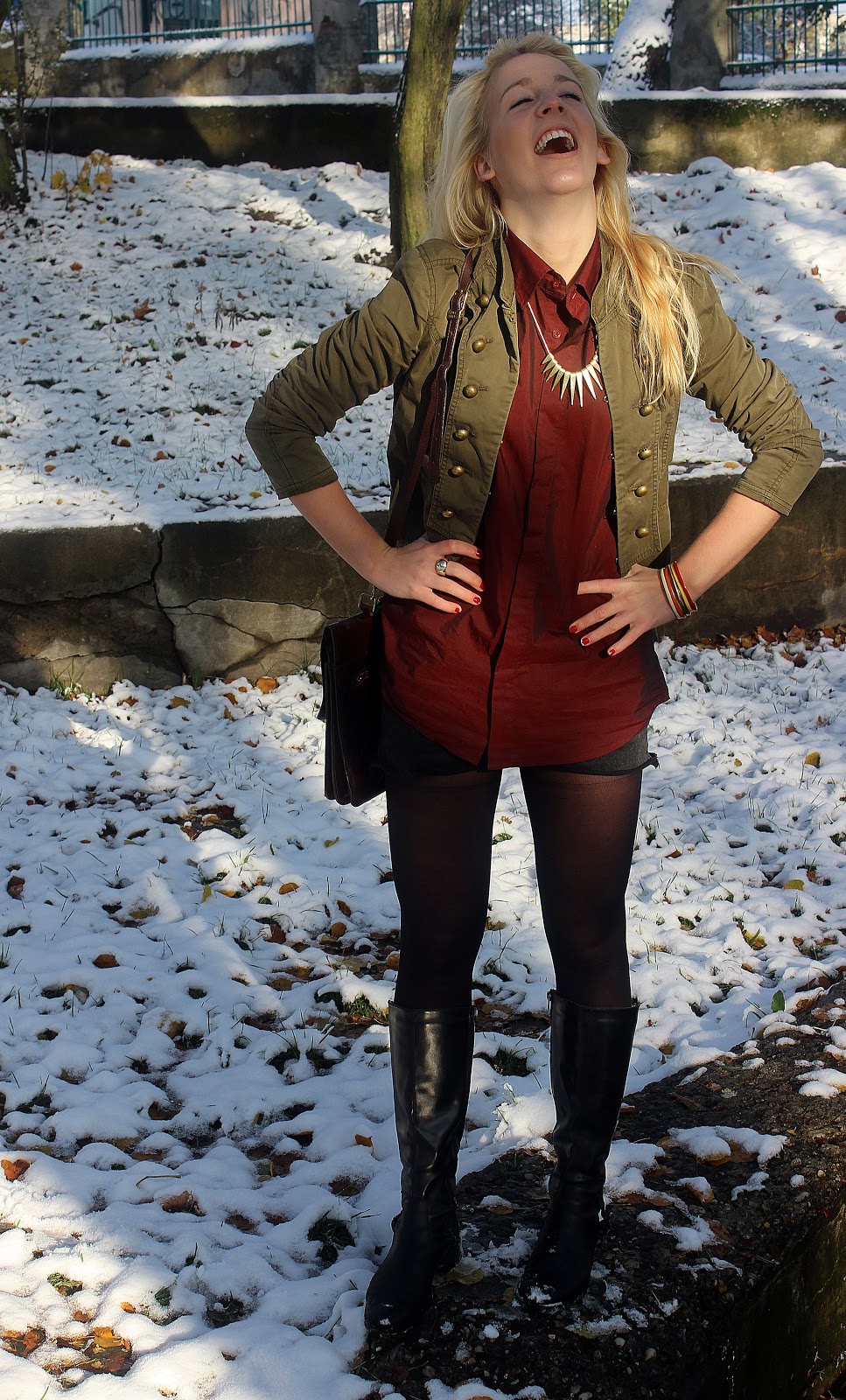 Dodatkowo złote guziki , które też przypominają mi mundur wojskowy . Całość dopełniają wojskowe oficerki .
