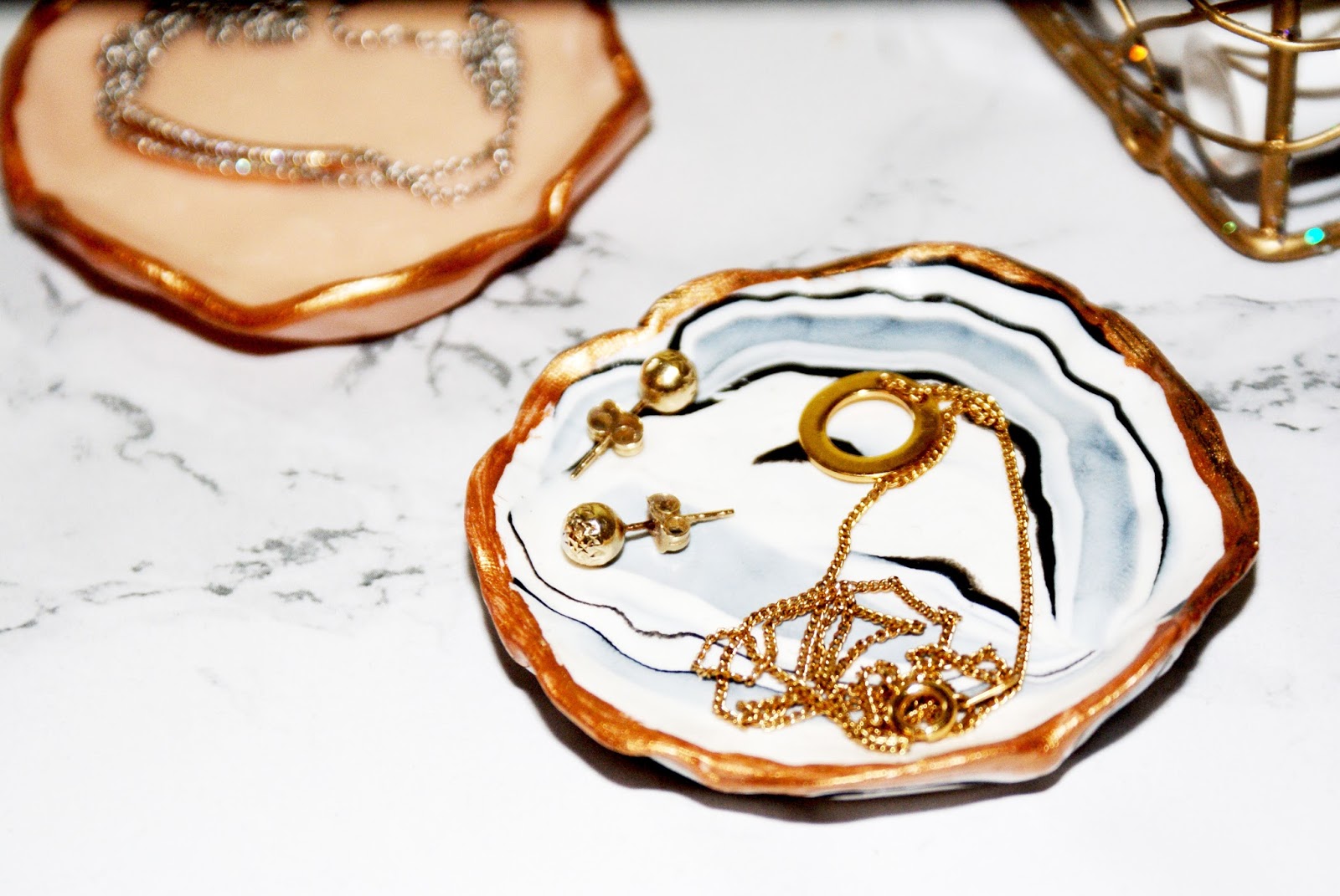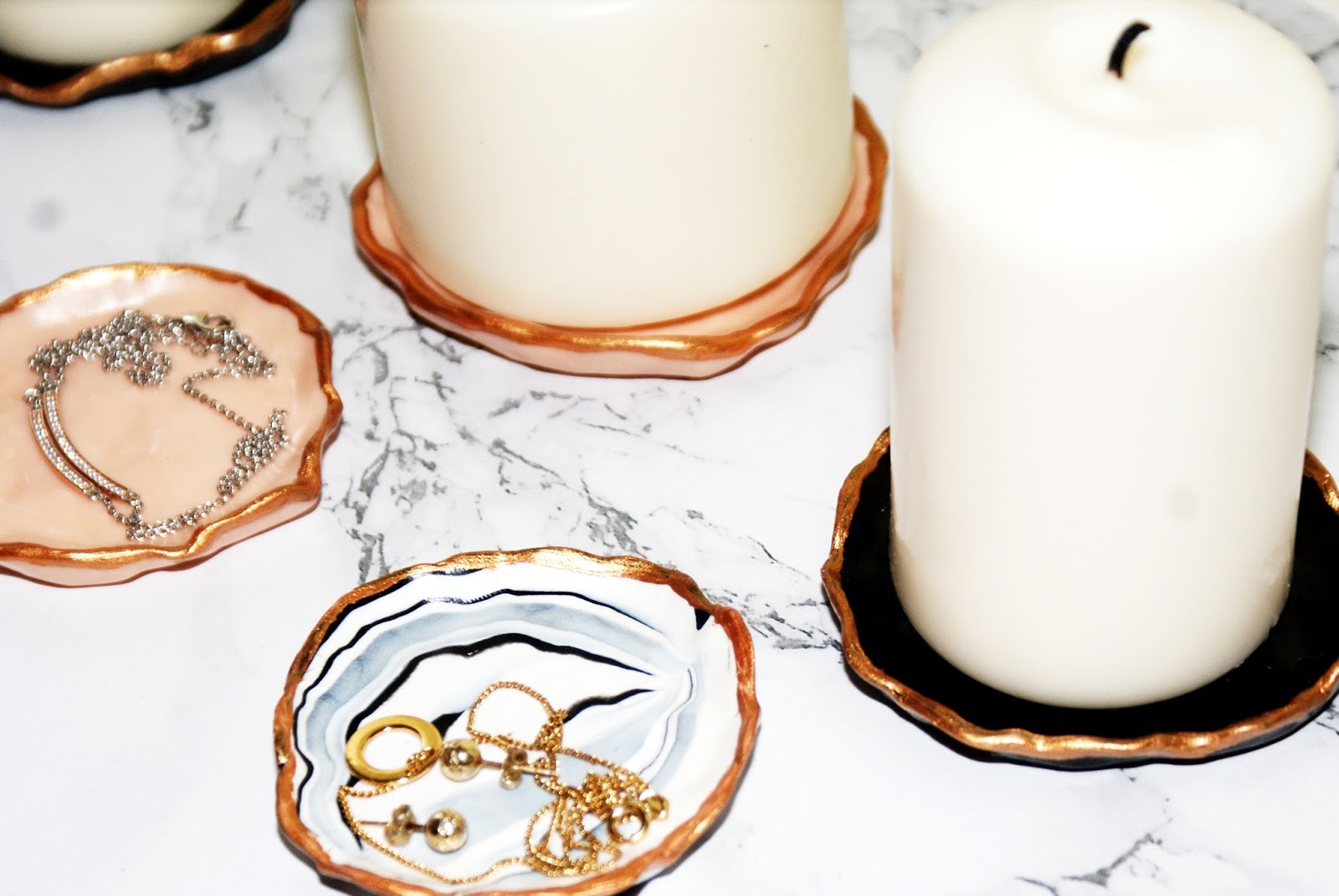 Ostatecznie tak prezentują się moje talerzyki. Na jednym kładę srebrną delikatną biżuterię, którą bardzo często wkładam, a na drugą złotą. Kolejne talerzyki służą jako podkładki pod świeczki.