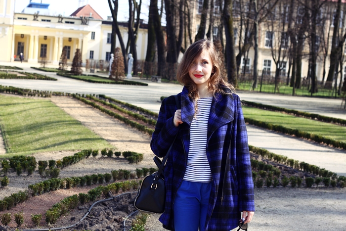 Paski, kratka, kratka w paski. Łączenie printów i wzorów to coś, co na pewno może ożywić monochromatyczny strój. Kobalt i inne odcienie niebieskiego są bardzo mile widziane tej wiosny i nadchodzącego lata. Na dzień, w którym jesteśmy zabiegani, potrzebujemy nałożyć na siebie coś wygodnego, spodnie to chyba najlepszy wybór.Płaszcz ma podobny kolor, więc całość łączy się prawie jak total look, prawie. Jeszcze trampki i można biegać po mieście :)