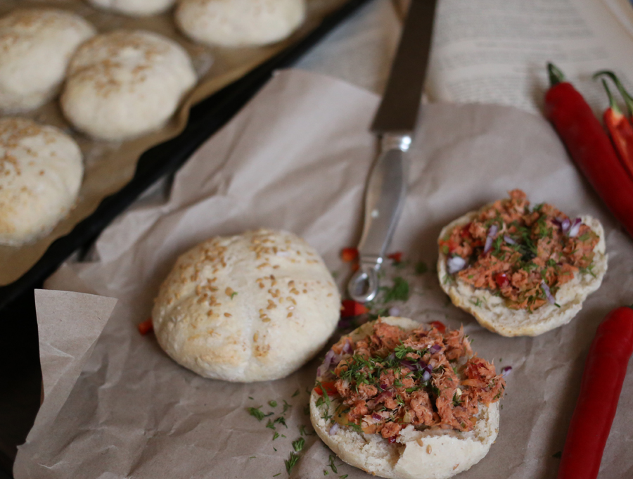 Jeśli znudziły Wam się jajecznice, omlety, kanapki i owsianki to mamy dla Was świetna opcję na niedzielne śniadanko. Robi się je nieco dłużej, dlatego lepiej tego dnia nigdzie się z rana nie spieszyć. Bułeczki pieczemy sami a nie ma na tym świecie nic pyszniejszego od gorącego, świeżego pieczywa. Do tego pasta z wędzonej makreli z warzywami. Makrela jest rybą tłustą, zawiera bardzo duże ilości kwasów omega-3 i omega-6. W trakcie jej kupowania zwróćcie uwagę na kolor, zapach oraz warunki w jakich jest przechowywana. Warto więc poszukać na opakowaniu umieszczonego przez producenta znaku GMP, który ma wskazywać na prawidłowy proces wędzenia. W przygotowywaniu śniadanka pomagała mi mama, bez niej by się nie udało. Polecam wypróbować przepis, zwłaszcza bułeczki. Oczywiście zamiast pasty możecie wykorzystać cokolwiek, ulubione warzywa i wędliny.